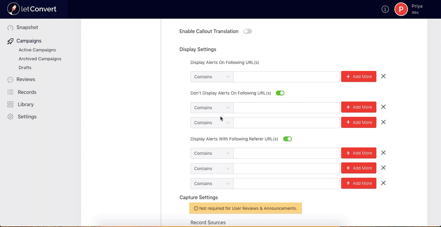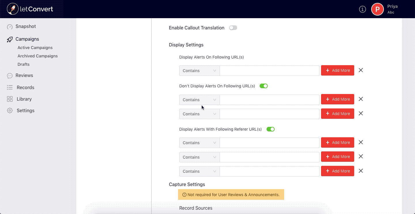 URL Targeting defines as a base for triggering the campaigns. It essentially allows you to specify the landing pages or website on which you would want to show the real time alerts.