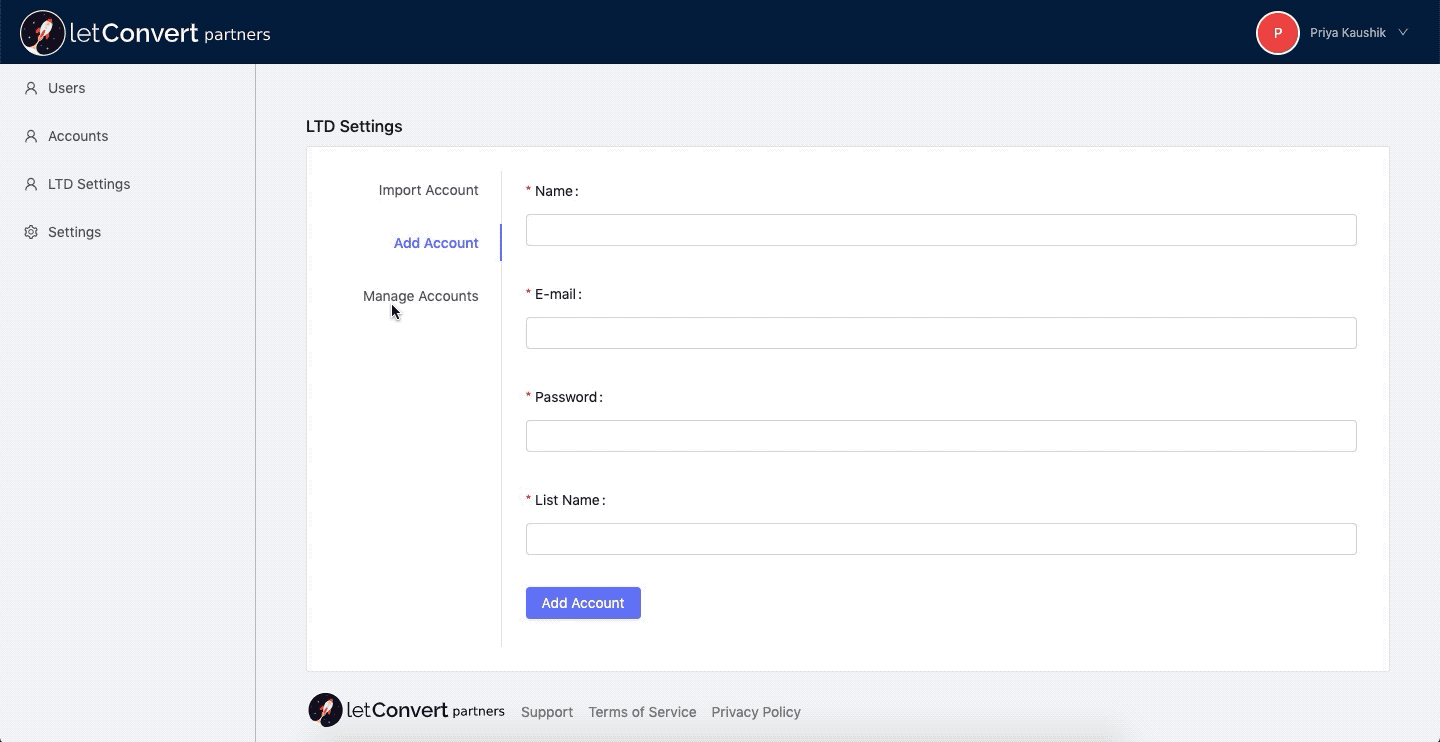 Under this section you can add account If you do not wish to import one. To be able to do so, you just simply need to enter the following details and click on ‘Add Account’.