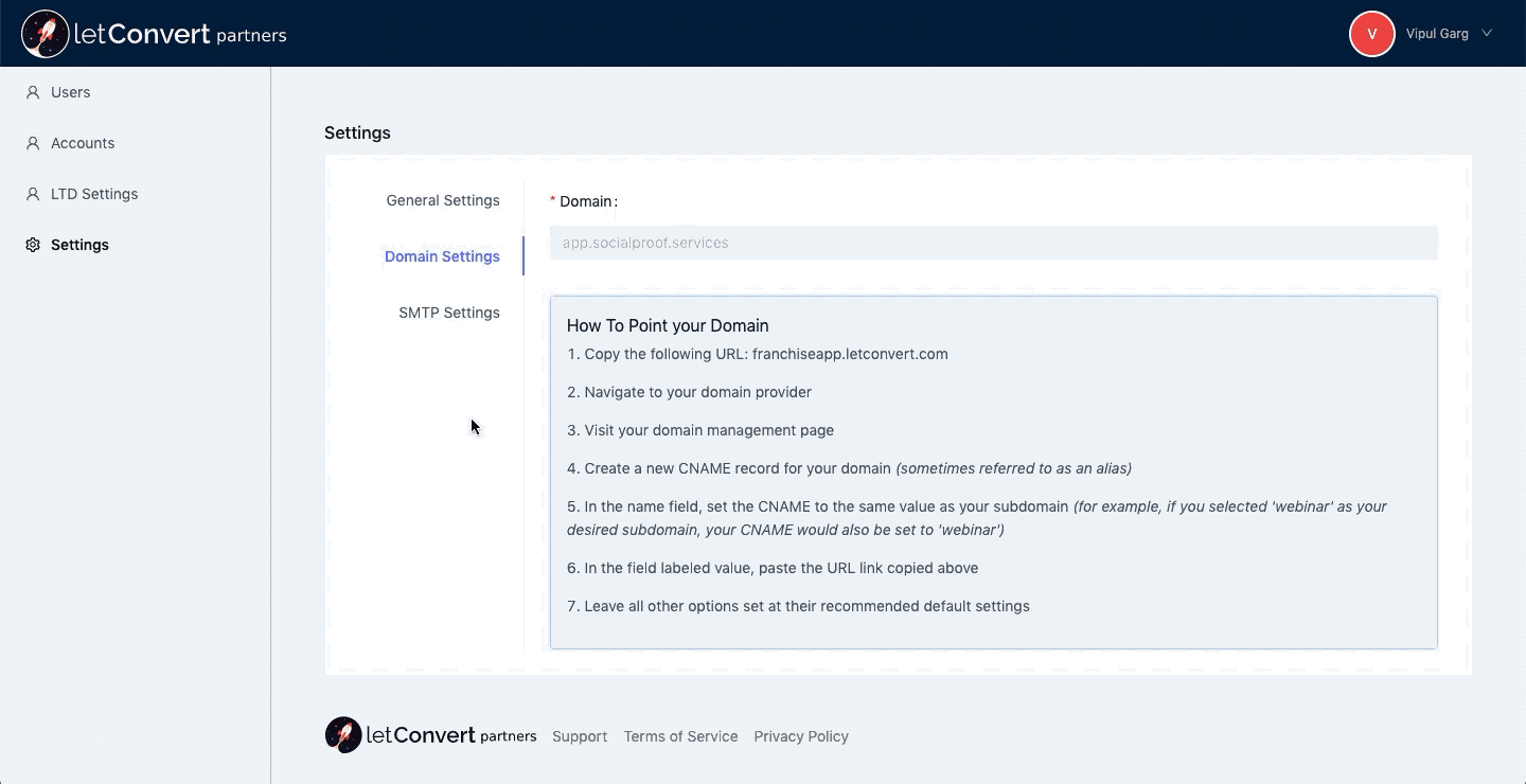 Under the Domain Settings, you need to enter your own domain and point it correctly (read the details mentioned in your dashboard). This domain will be the one where you would want to host your whitelabel account.
