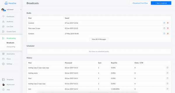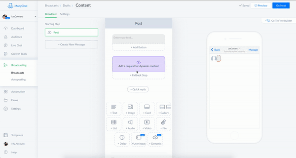 Step 1: Go to your ManyChat Account >> New Broadcast >> Dynamic.