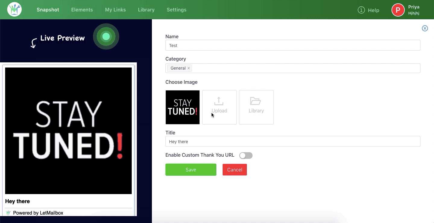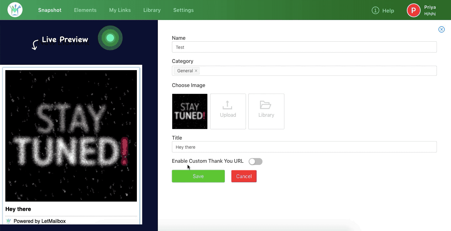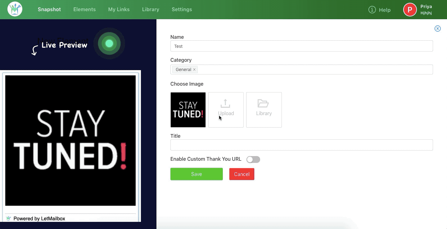 To be able to create an Image Embed Element, follow the simple steps listed below: Step 1: In your LetMailbox dashboard, go to Create New Element >> Image Embed. Step 2: Enter your ‘Name’ and select ‘Category’. Note: In case you have not ...