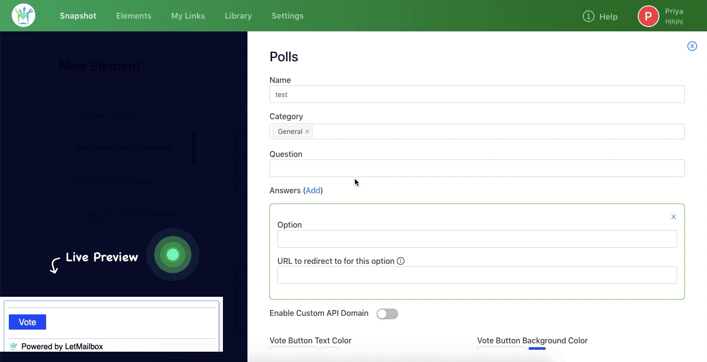 To be able to create a Poll Element, follow the simple steps listed below: Step 1: In your LetMailbox dashboard, go to Create New Element >> Polls. Step 2: Enter your ‘Name’ and select ‘Category’. Note: In case you have not added any category, you ...