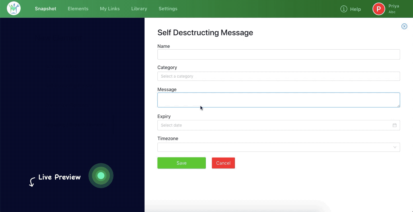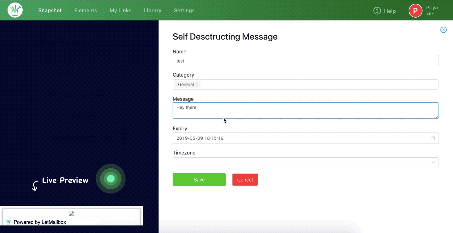 Step 1: In your LetMailbox dashboard, go to Create New Element >> Self Destructing Messages.