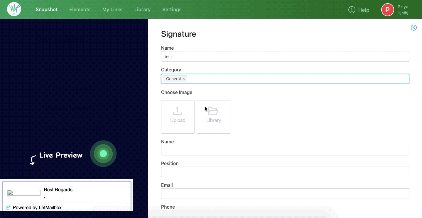 Step 1: In your LetMailbox dashboard, go to Create New Element >> Signatures.