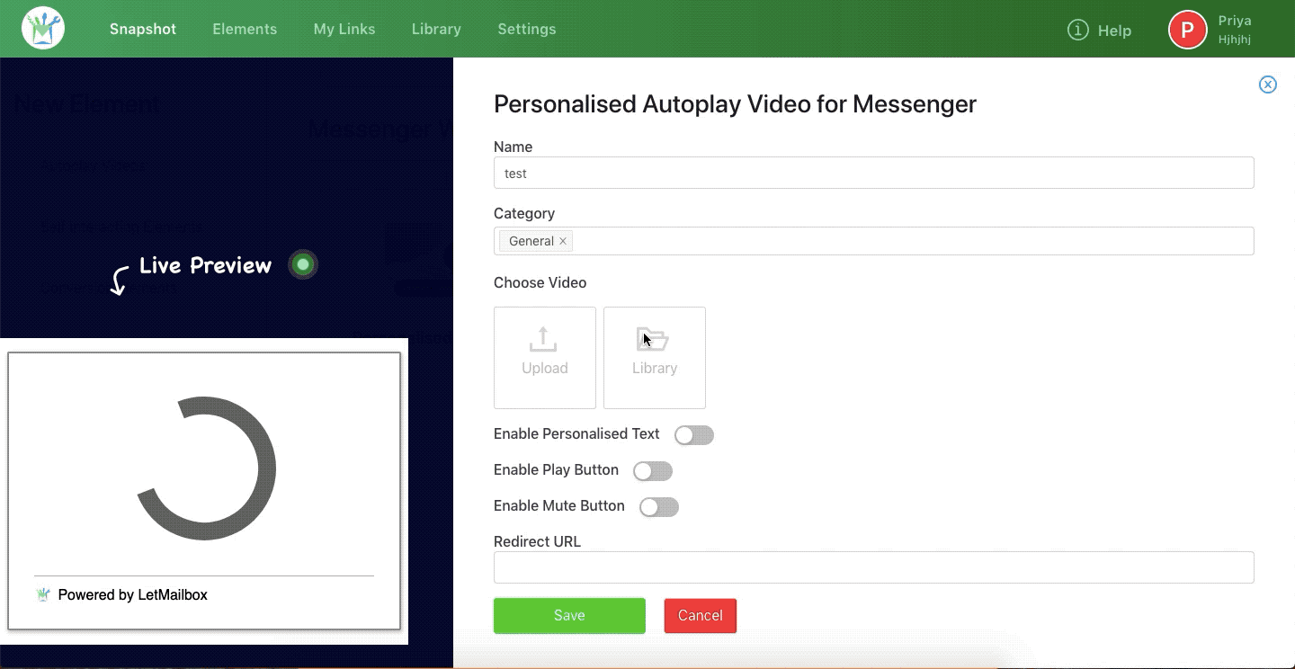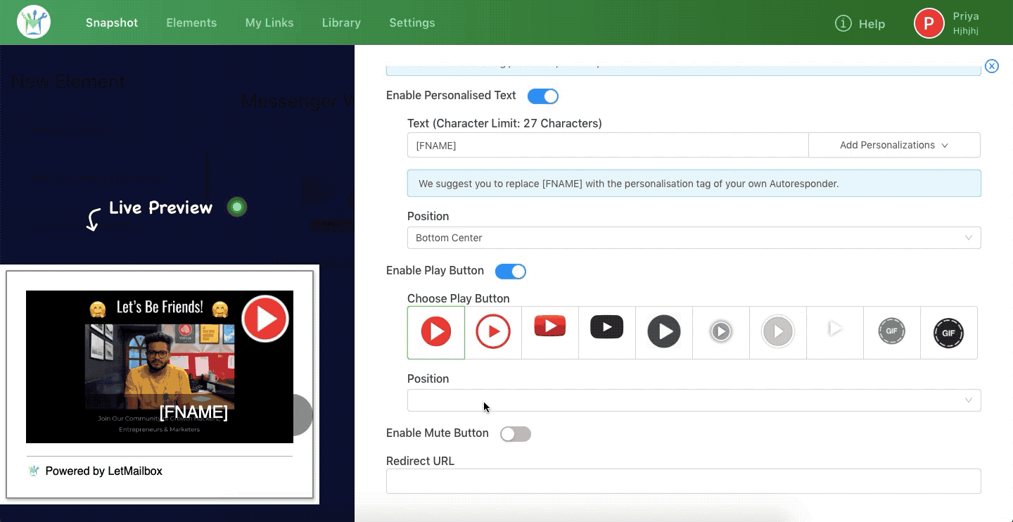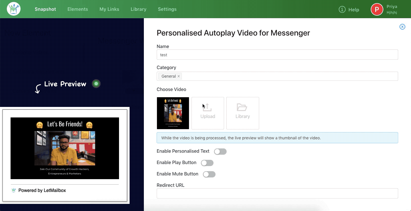 Step 1: In your LetMailbox dashboard, go to Create New Element >> Personalised Autoplay Video (under Messenger Widgets).