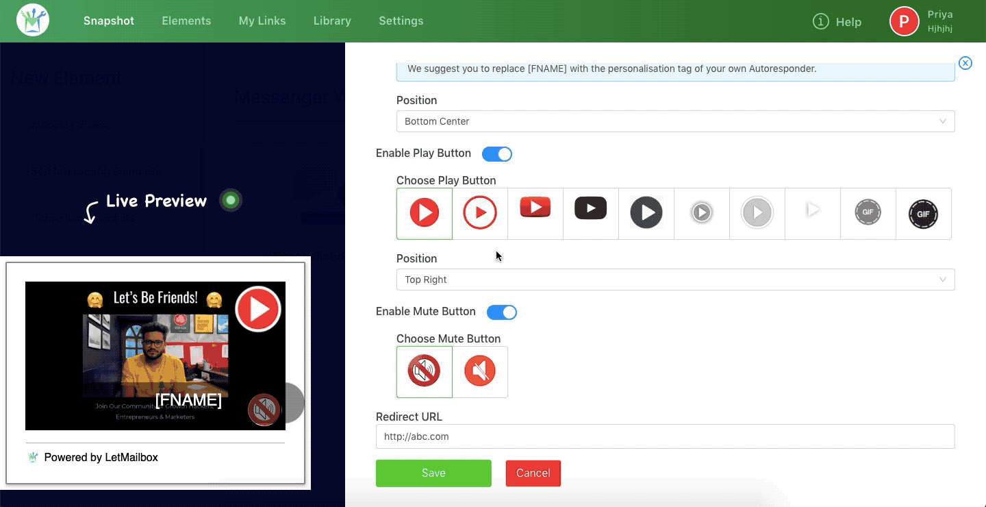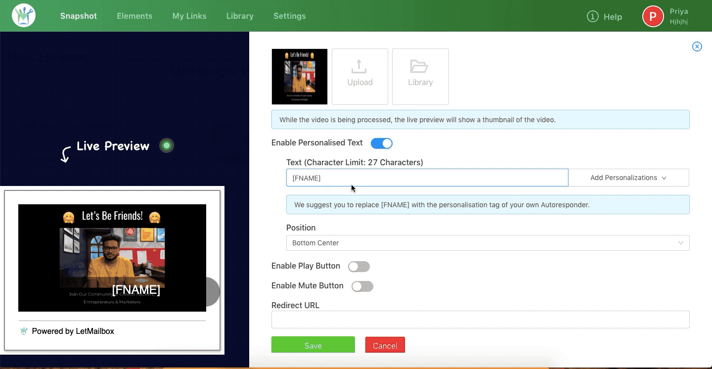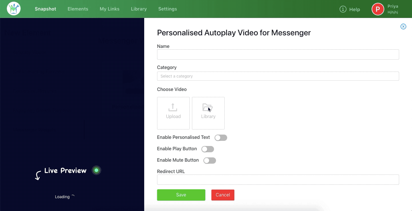 Step 1: In your LetMailbox dashboard, go to Create New Element >> Personalised Autoplay Video (under Messenger Widgets).