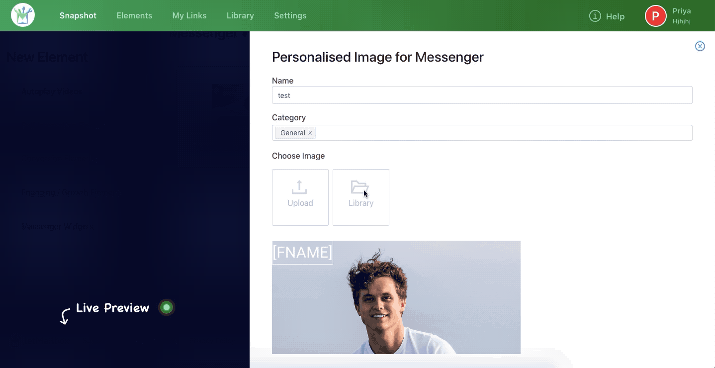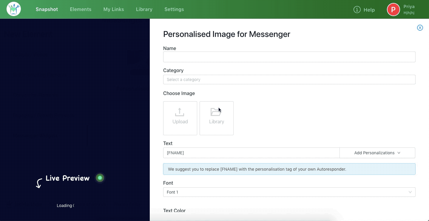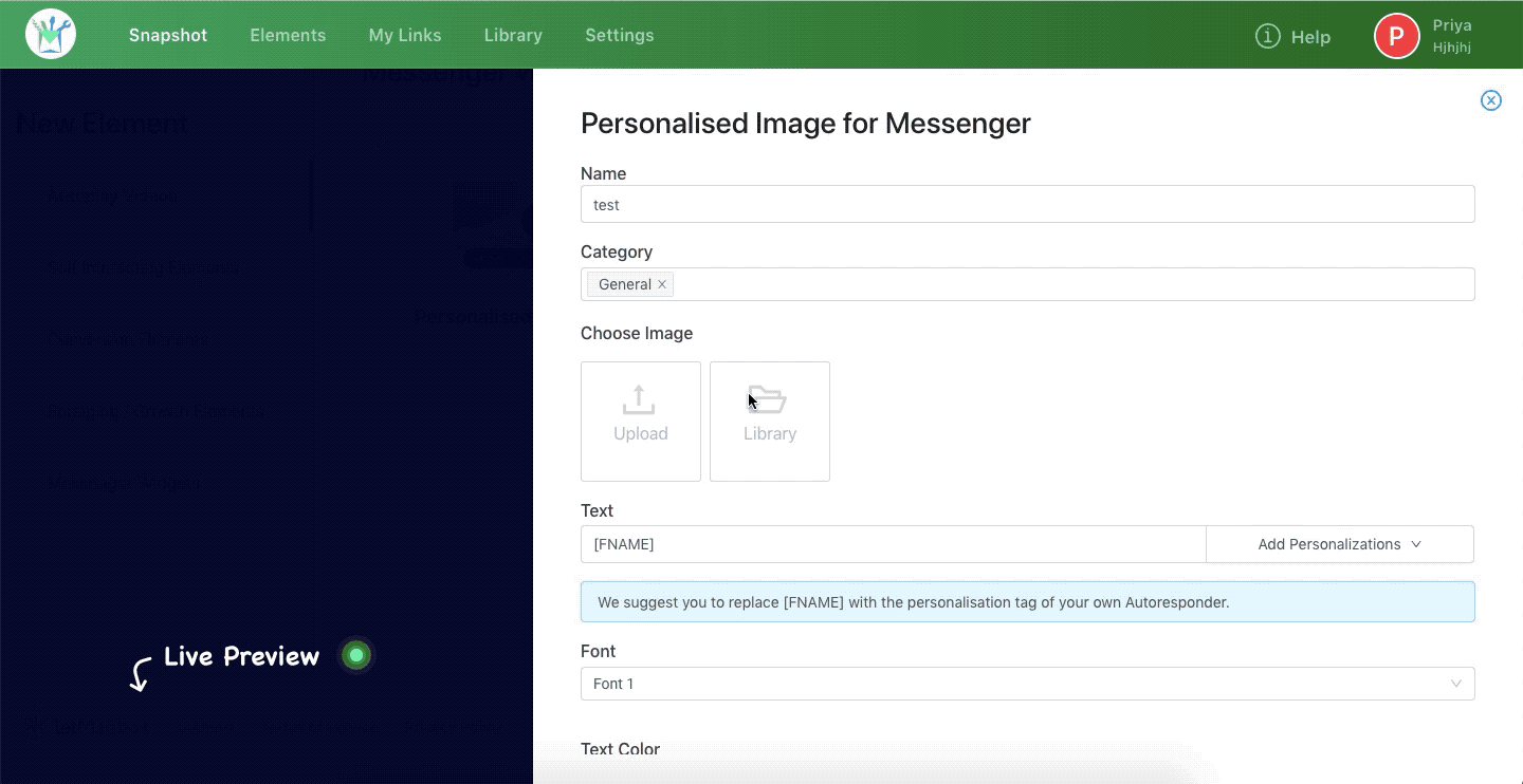 Step 1: In your LetMailbox dashboard, go to Create New Element >> Personalized Images (under Messenger Widgets).