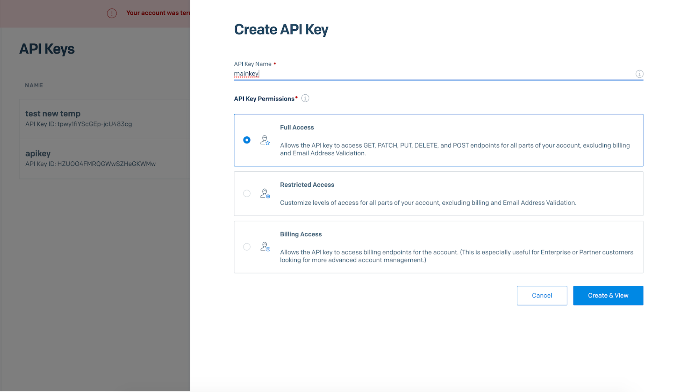 Step 4: Enter any desired 'API Key Name' and click on 'Full Access'.