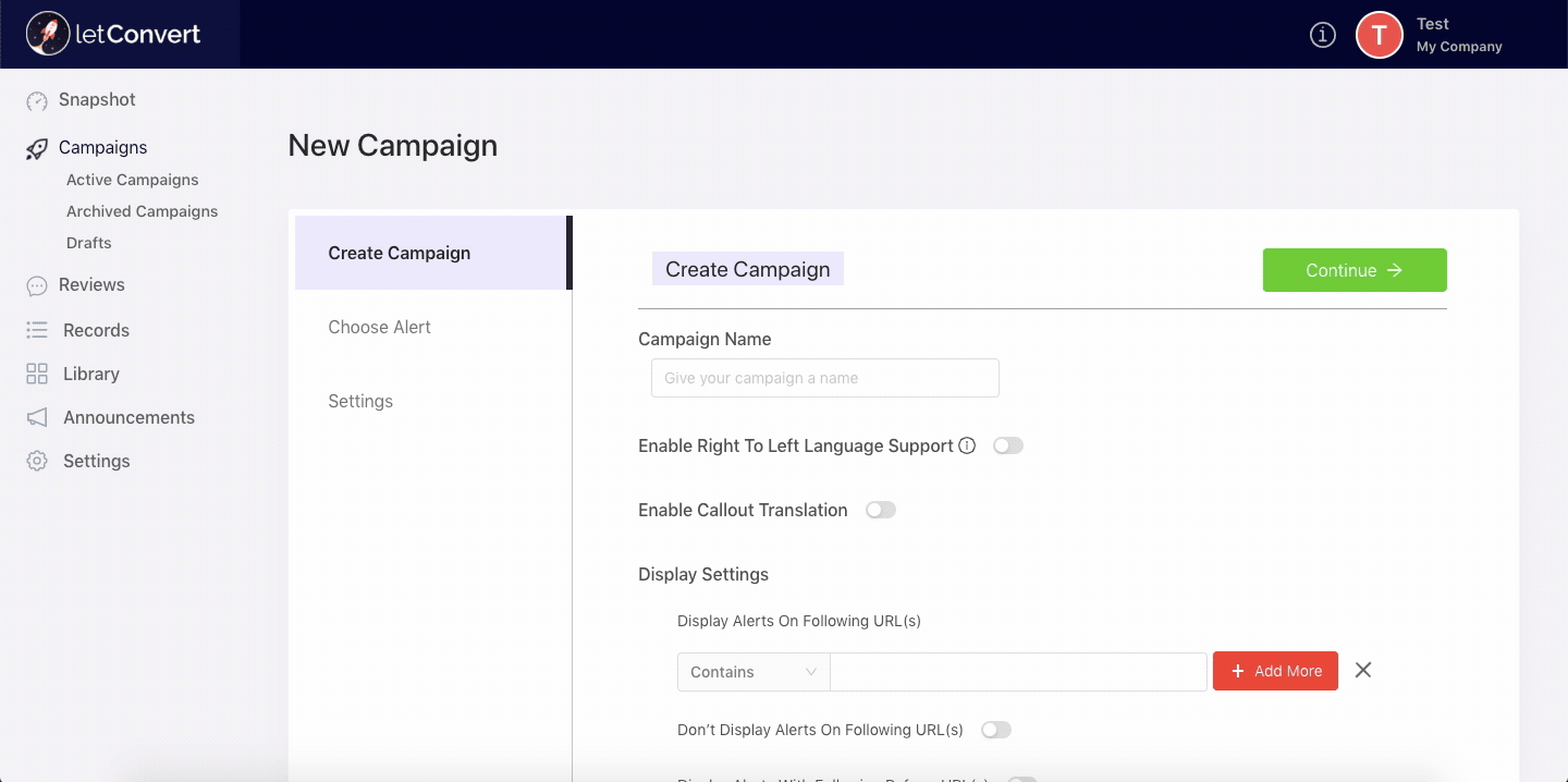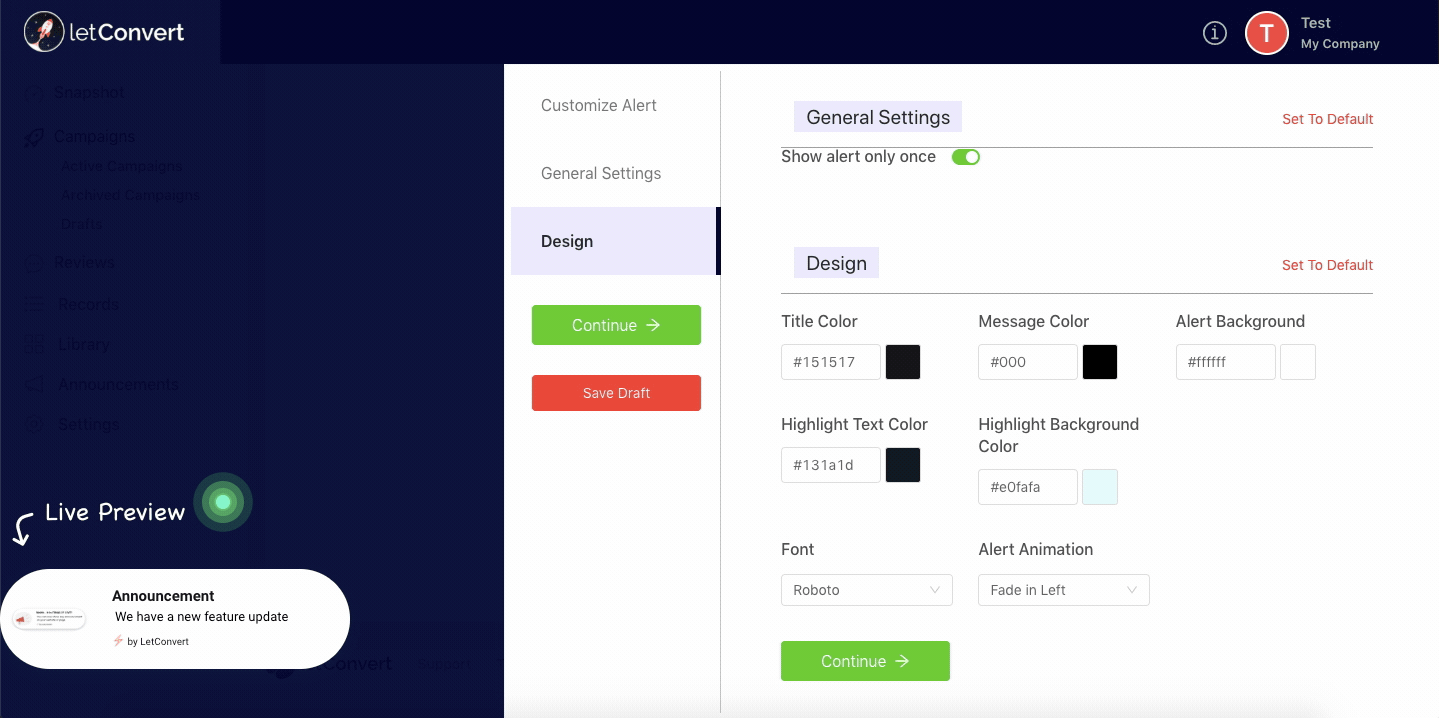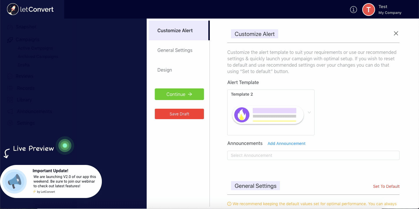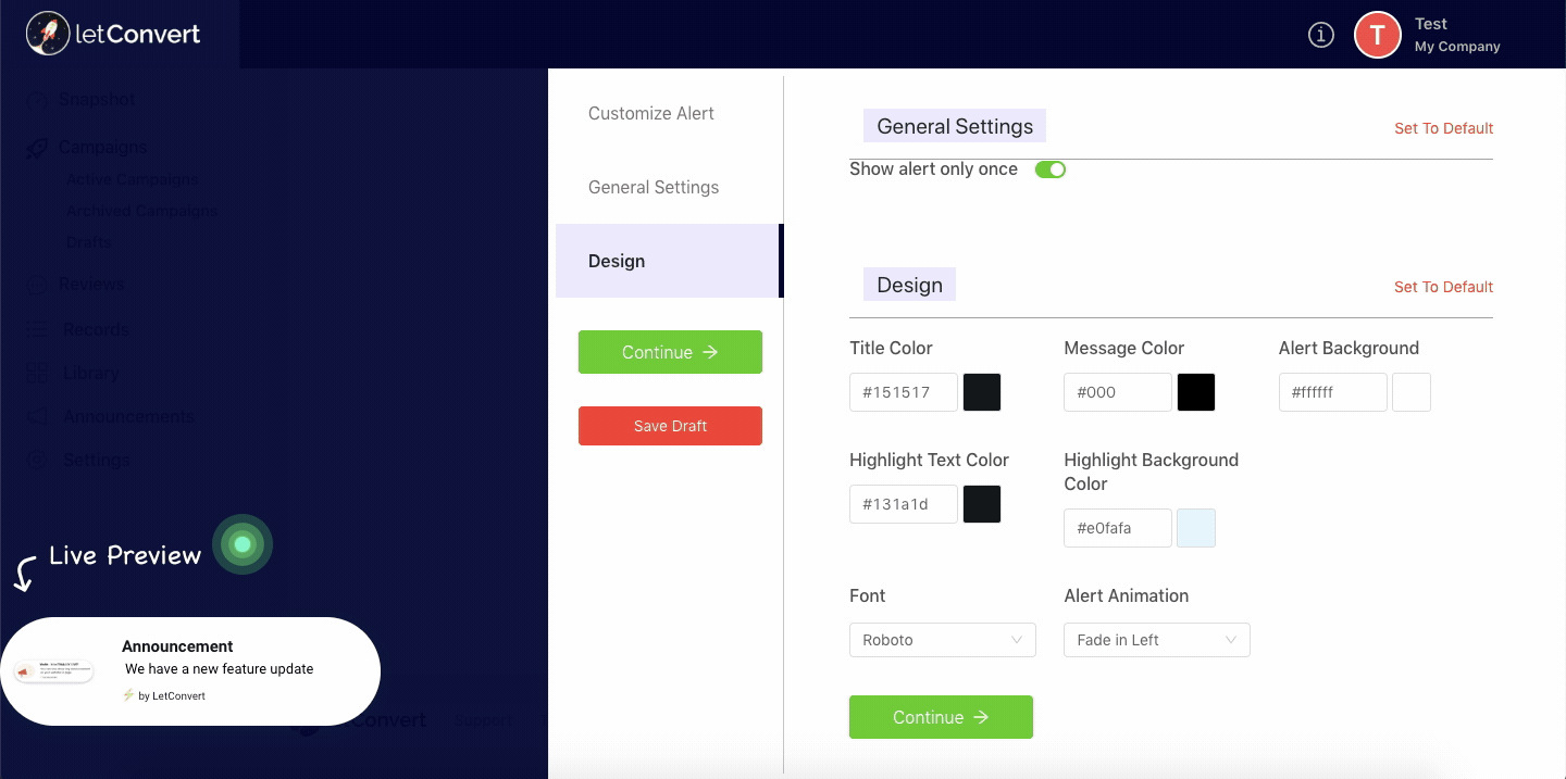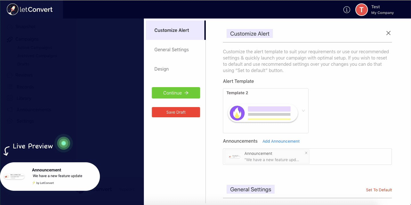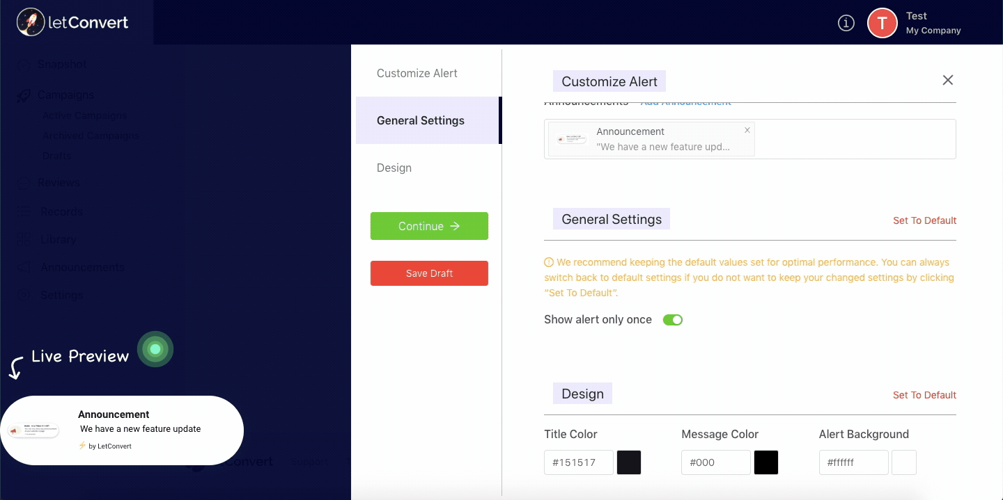 Creating an Announcement campaign is a very easy process in the LetConvert Dashboard.