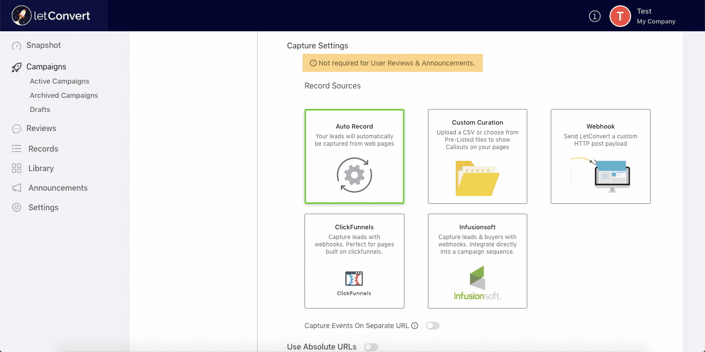 Select the Record Source or enter a URL if you wish to capture events from a separate URL after switching the toggle on.