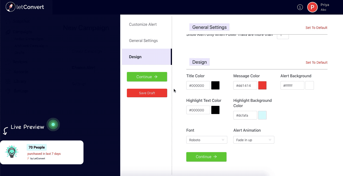 1. You can change the Title Color, Message Color & Alert Background Color by simply clicking on the color at their right-hand side. You can also see the live preview of the alert at the left hand side of the dashboard.