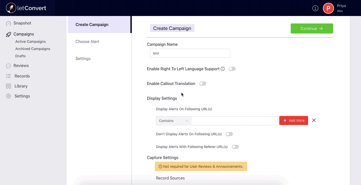 Enter the campaign name, and enable Right to left language support & Callout translation if you wish to enable them.