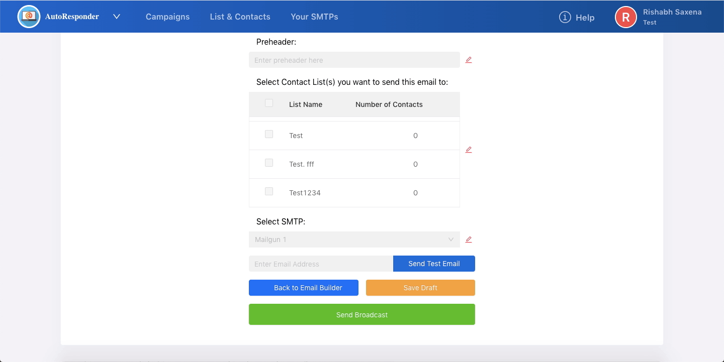 We suggest that you also 'Send a Test Email' on your email id to see what your broadcast email will ultimately look like. If you still feel that you need to go 'Back to the Email Builder' to change or add anything - you can easily do that as well.
