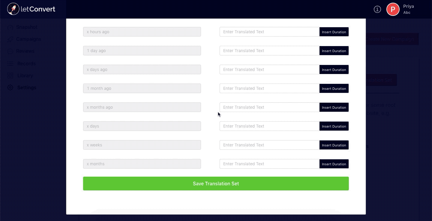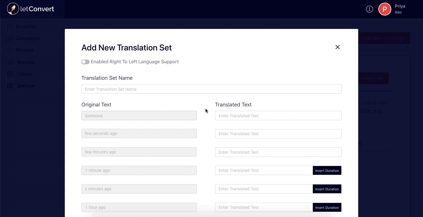 Step 1: In your LetConvert Dashboard, go to Settings >> Translation >> Add New Translation Set.