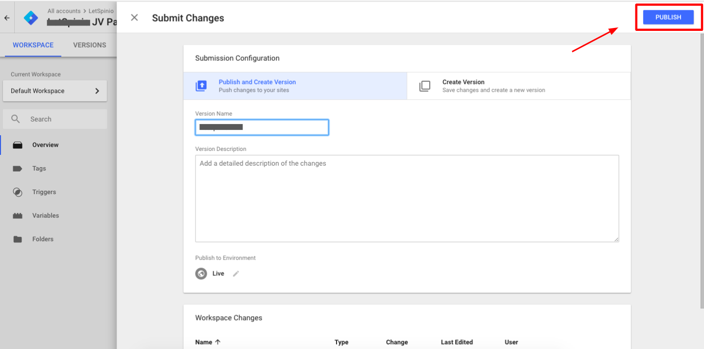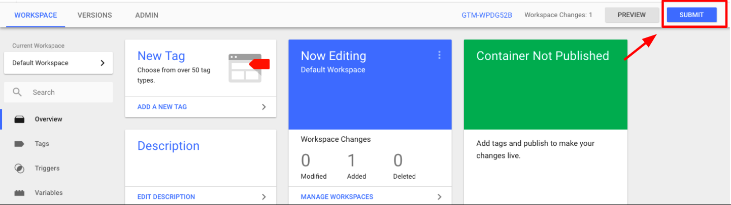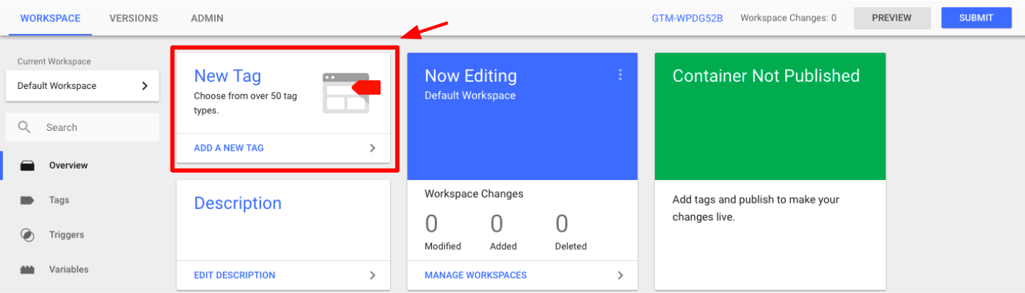 STEP 1: In your Google Tag Manager account, go to Workspace, and select “New Tag”.