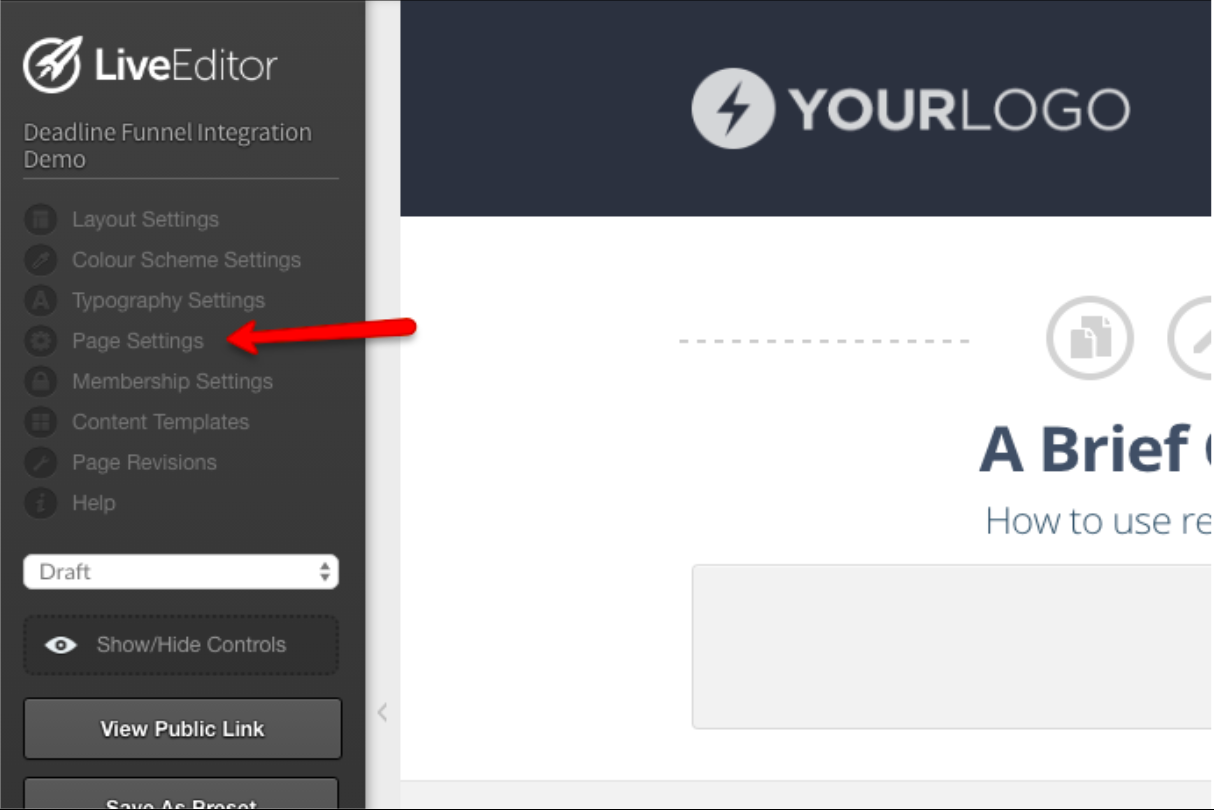 STEP 1: Log into your OptimizePress Page Editor and click on “Page Settings”.