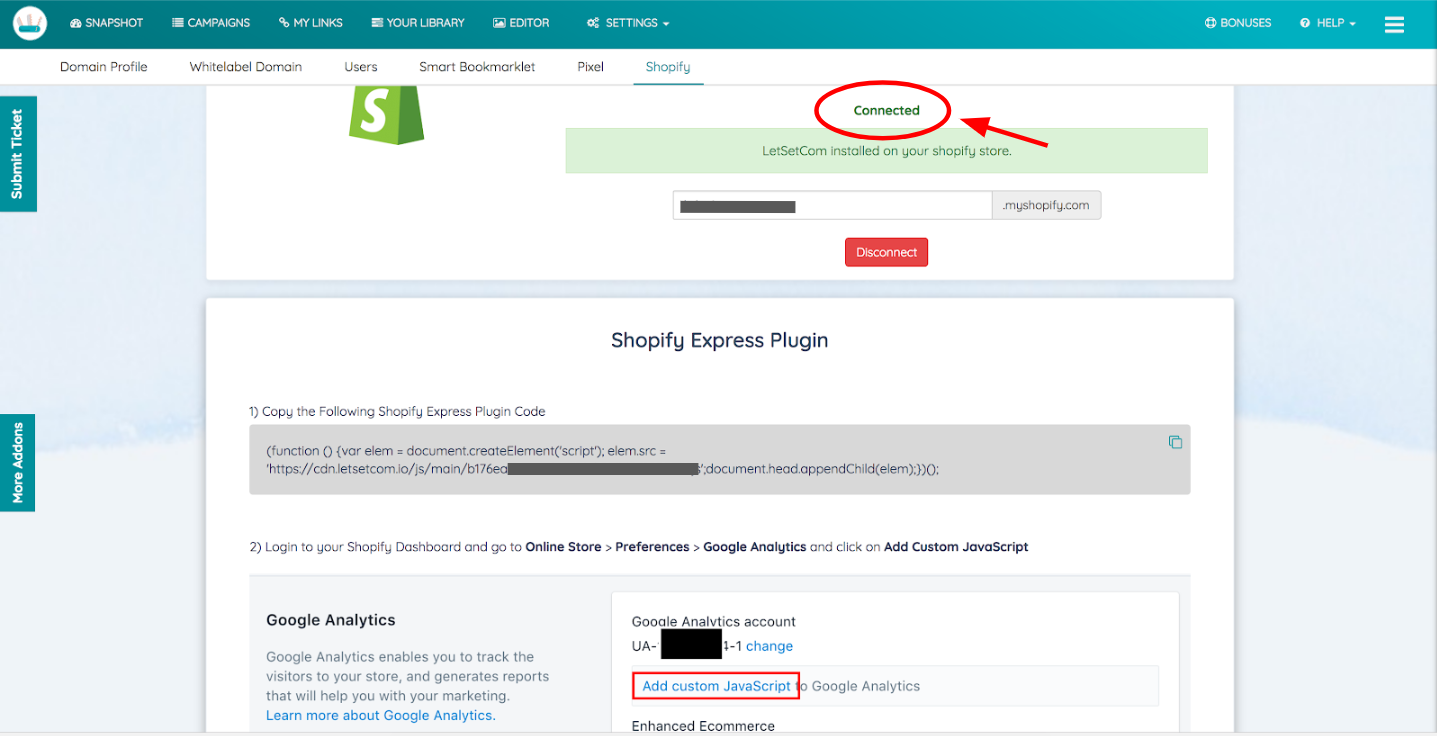 STEP 5: Again, you’ll be redirected to the LetSetCom Dashboard and you’ll see the status as “Connected”. It implies that your LetSetCom pixel/code has been installed to your Shopify store successfully.