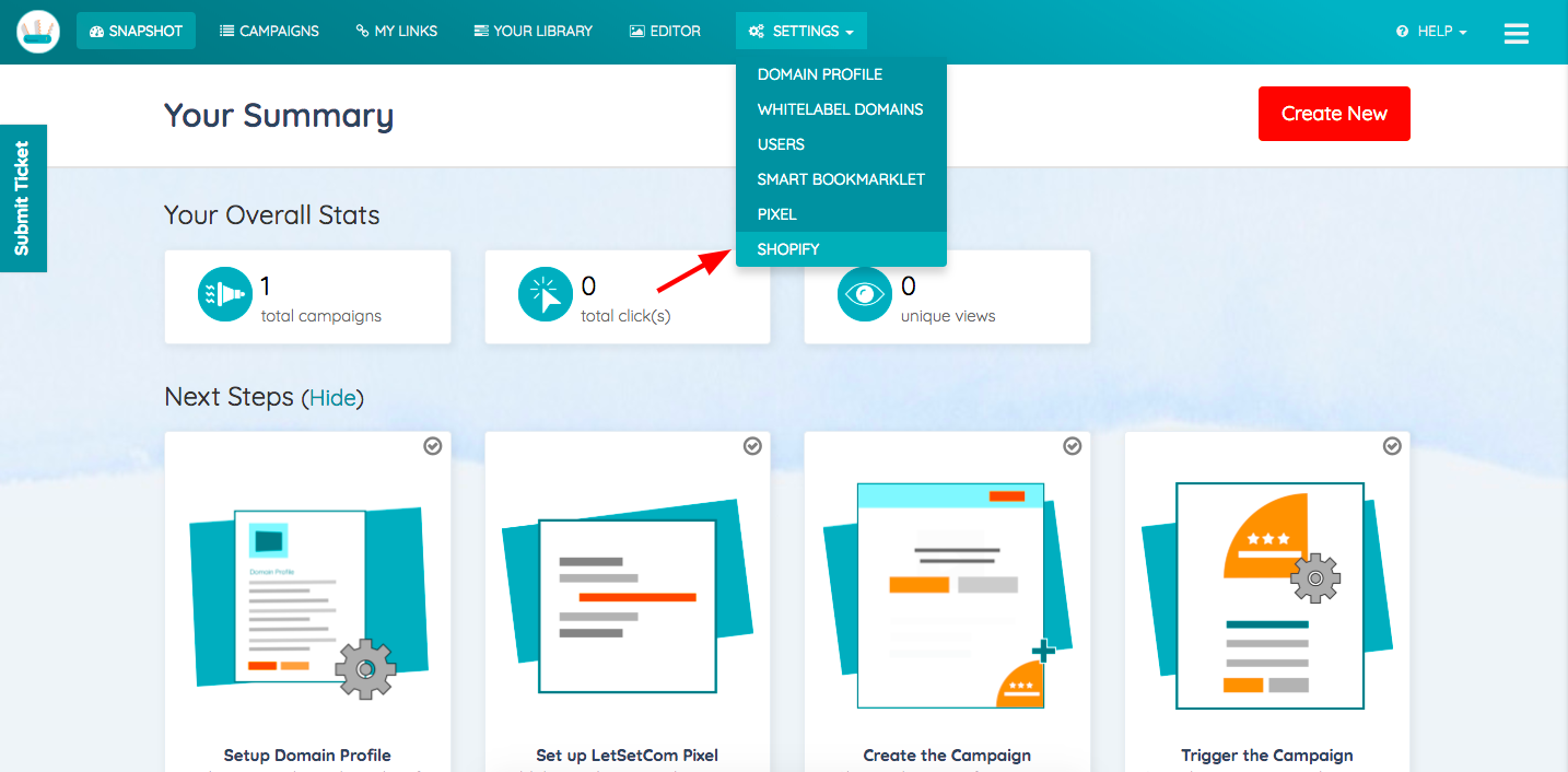 STEP 1: In your LetSetCom Dashboard, go to “Settings”, click on “Shopify”.
