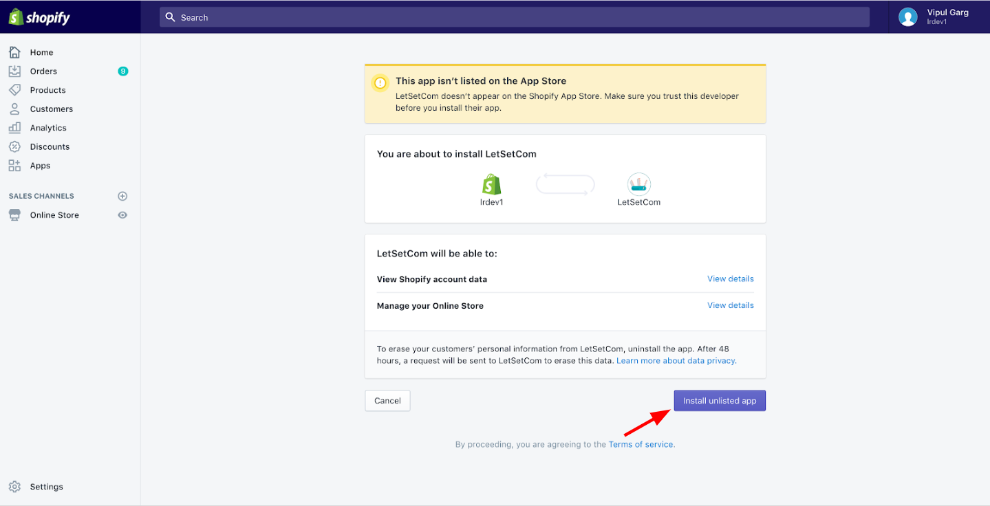 STEP 4: Click on “Install Unlisted App” in order to install the LetSetCom Pixel/Code to your Shopify Store.