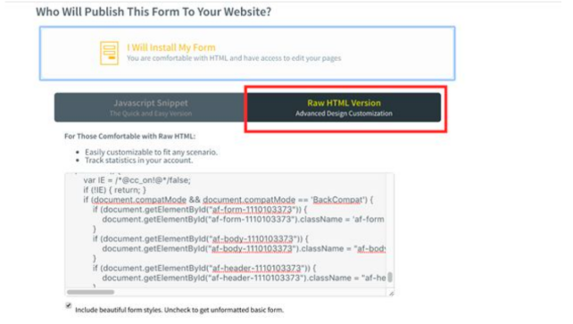 STEP 3: Scroll down to the section that says "Who Will Publish This Form To Your Website" and select "I Will Install My Form".