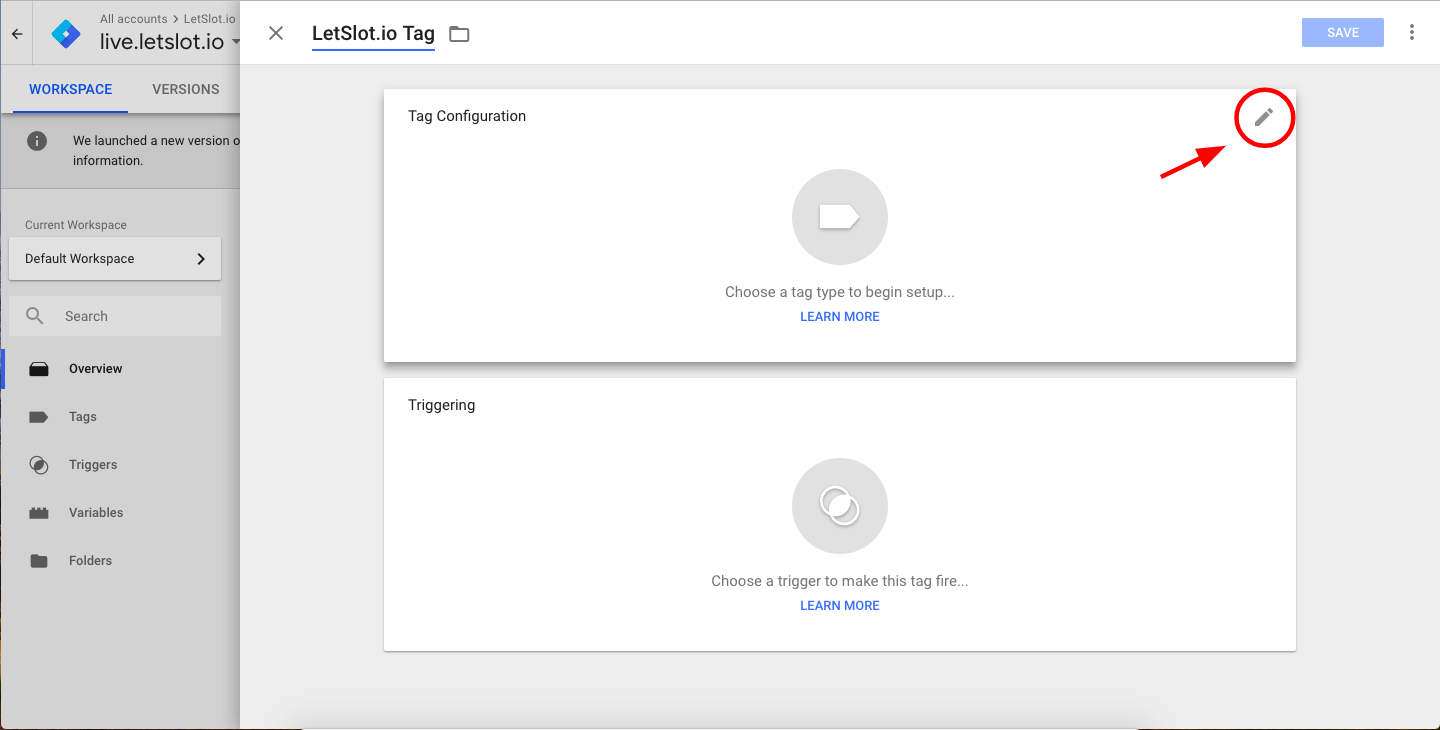 To be able to install LetSetCom Code/Pixel in your website with Google Tag Manager, follow the steps below : STEP 1: In your Google Tag Manager account, go to Workspace, and select “New Tag”. STEP 2: A popup with open with the New Tag configuration ...