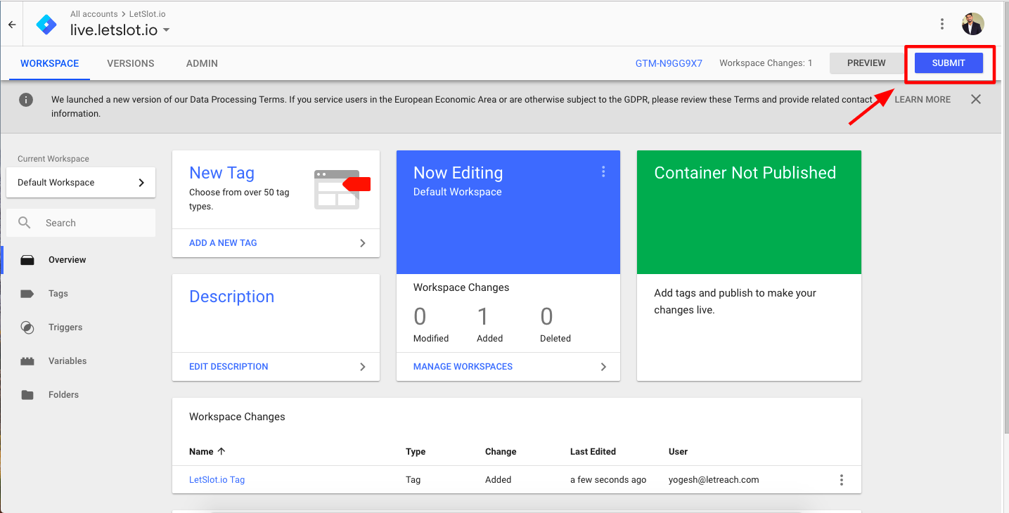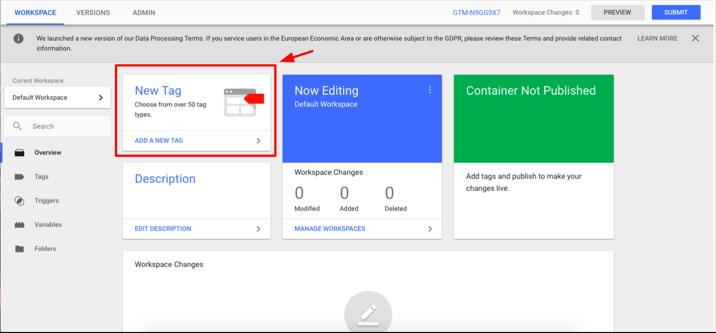 STEP 1: In your Google Tag Manager account, go to Workspace, and select “New Tag”.