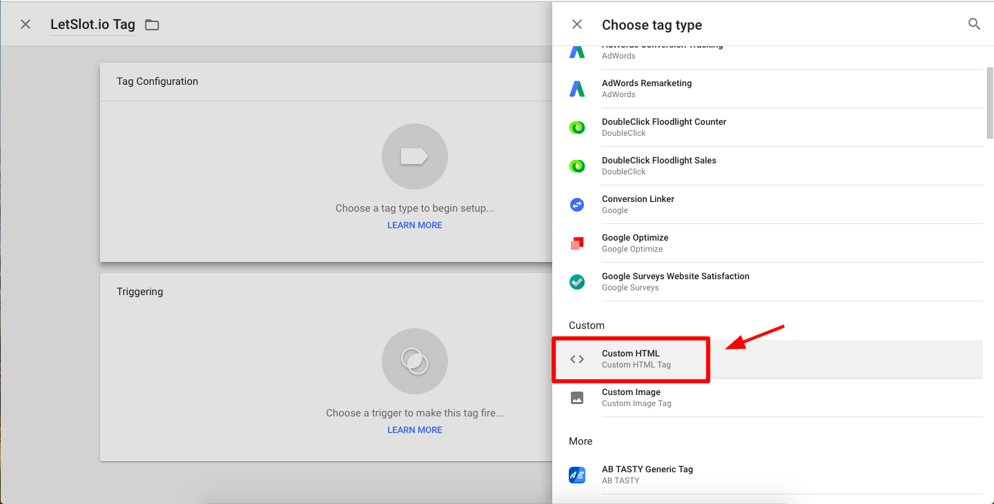 STEP 3: Click on the “Custom HTML” Tag in the custom section and paste the LetSlot.io integration code.