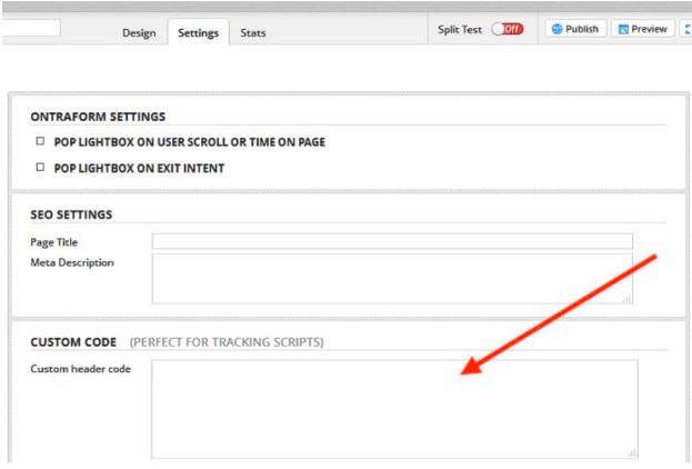 STEP 1: Add the LetSlot.io pixel to the ”custom header code” section on the Settings tab inside Ontraport.