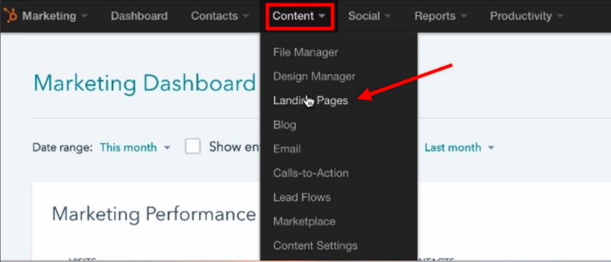 STEP 1: Log into your Hubspot Content Editor and click on "Landing Pages" under the "Contents" tab.