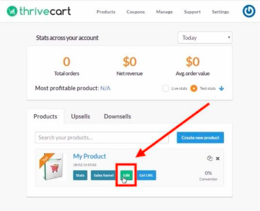 STEP 1: Login to ThriveCart and select “Edit” under the product you intend to Add LetSpin.io Code/Pixel to.