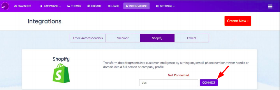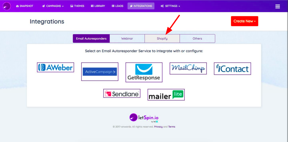 STEP 2: Under the Integrations Category, go to “Shopify” as shown in the screenshot below.