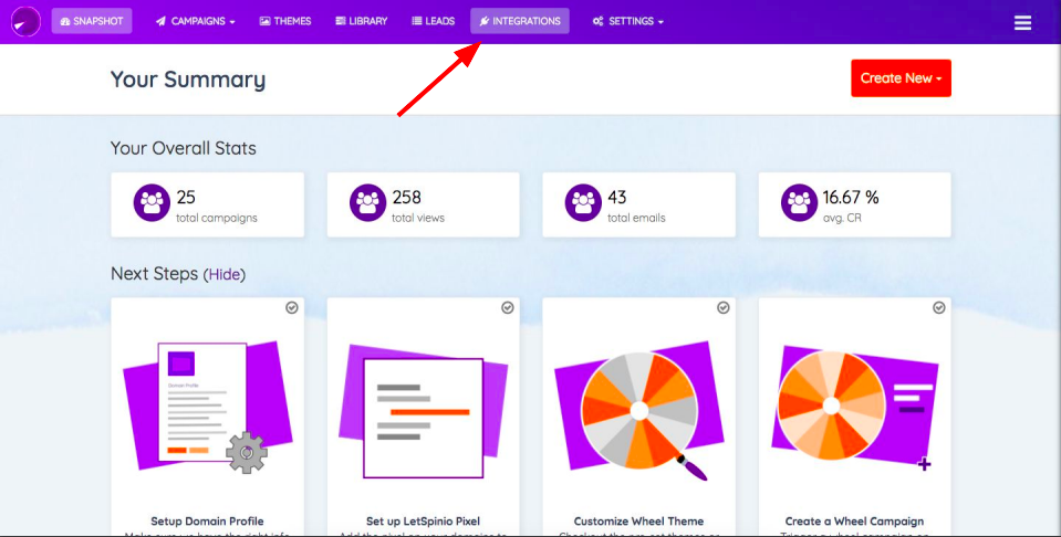 STEP 1: In your LetSpin.io Dashboard, go to “Integrations”.