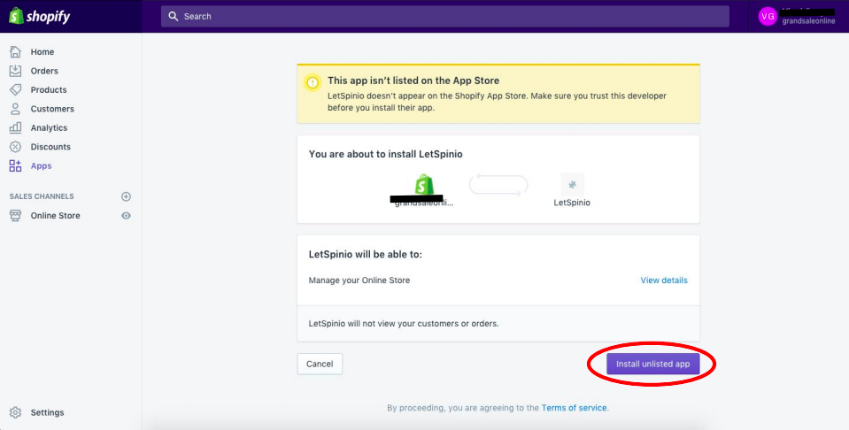 STEP 5: Click on “Install Unlisted App” in order to install the LetSpin.io Pixel/Code to your Shopify Store.