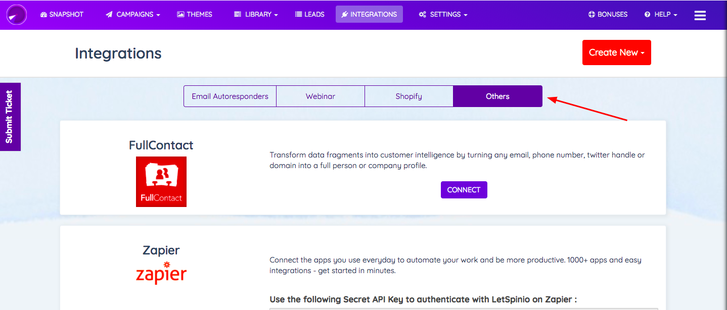 STEP 3: Now, in your LetSpin.io Dashboard, go to “Integrations”, click on “Others”.