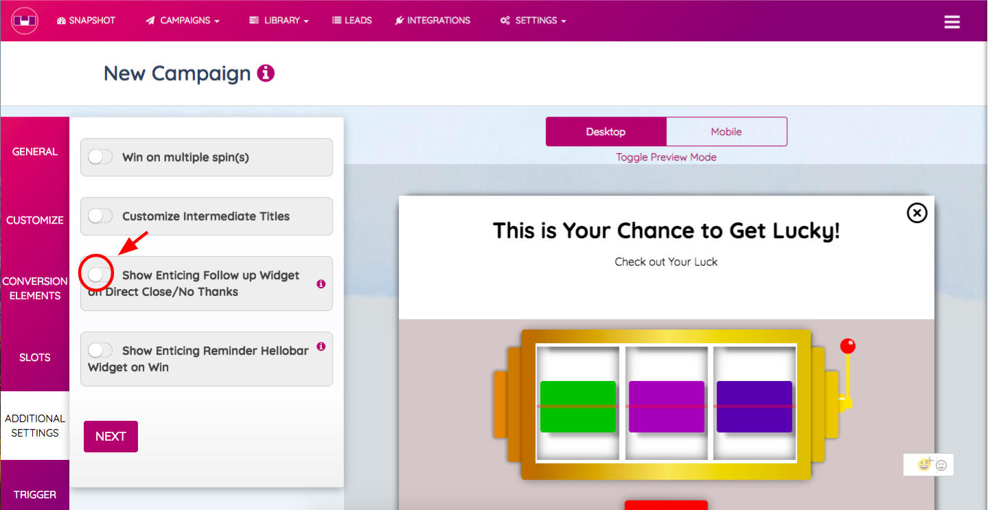 C. Show Enticing Follow up Widget on Direct Close/No Thanks: You can choose to add or remove the Follow-up Widget as per your suitability. Learn more about Follow Up Widget, click here.