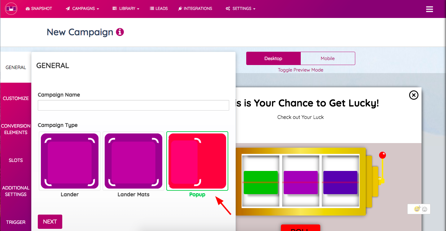 To be able to set up a Lander Campaign, follow the steps listed below: STEP 1: In your LetSlot.io Dashboard and click on “Create New” and select “Slot Campaign”. STEP 2: Fill in your “Campaign Name’. NOTE: The campaign name is for your internal ...