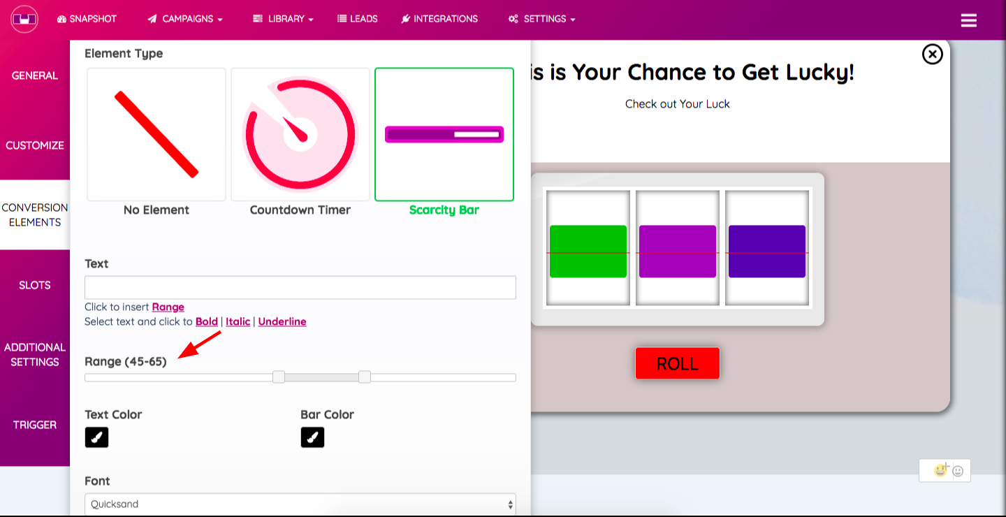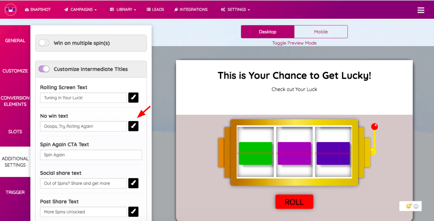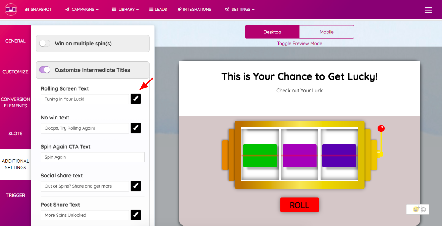 Rolling Screen Text- Under this, you can write whatever you wish to display when the visitor has spun the Slot Machine and it is rolling. You can even customize the color of the text by clicking on the brush icon.