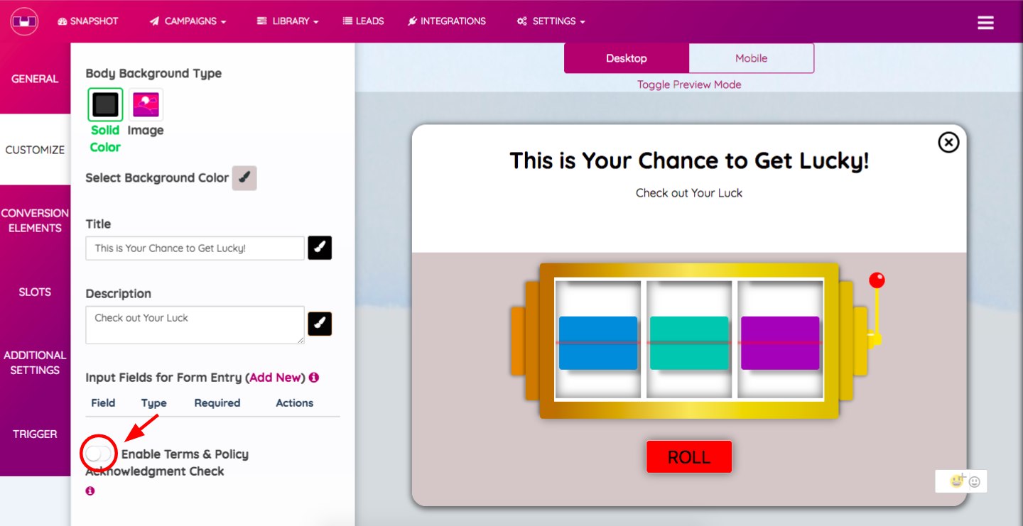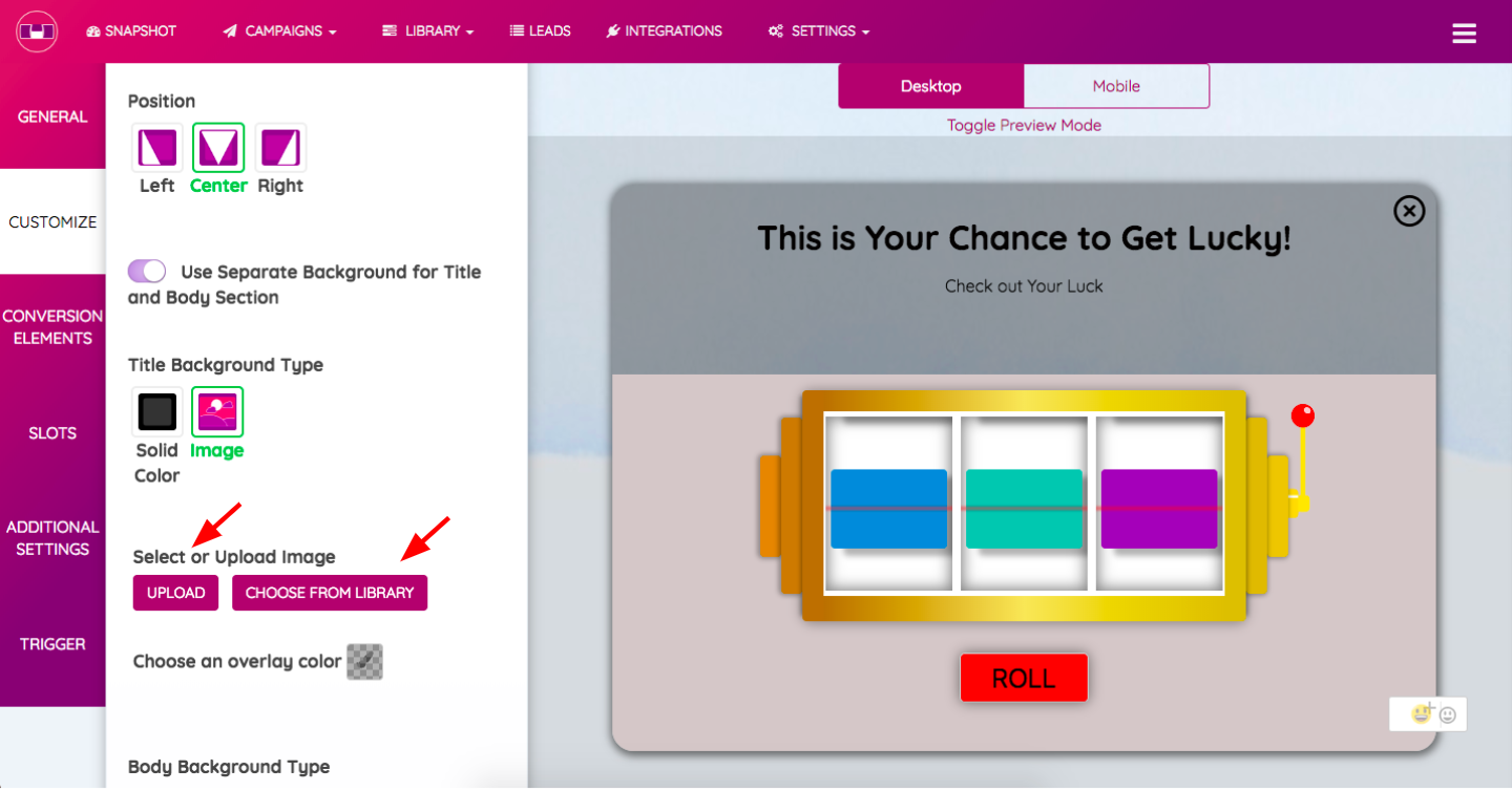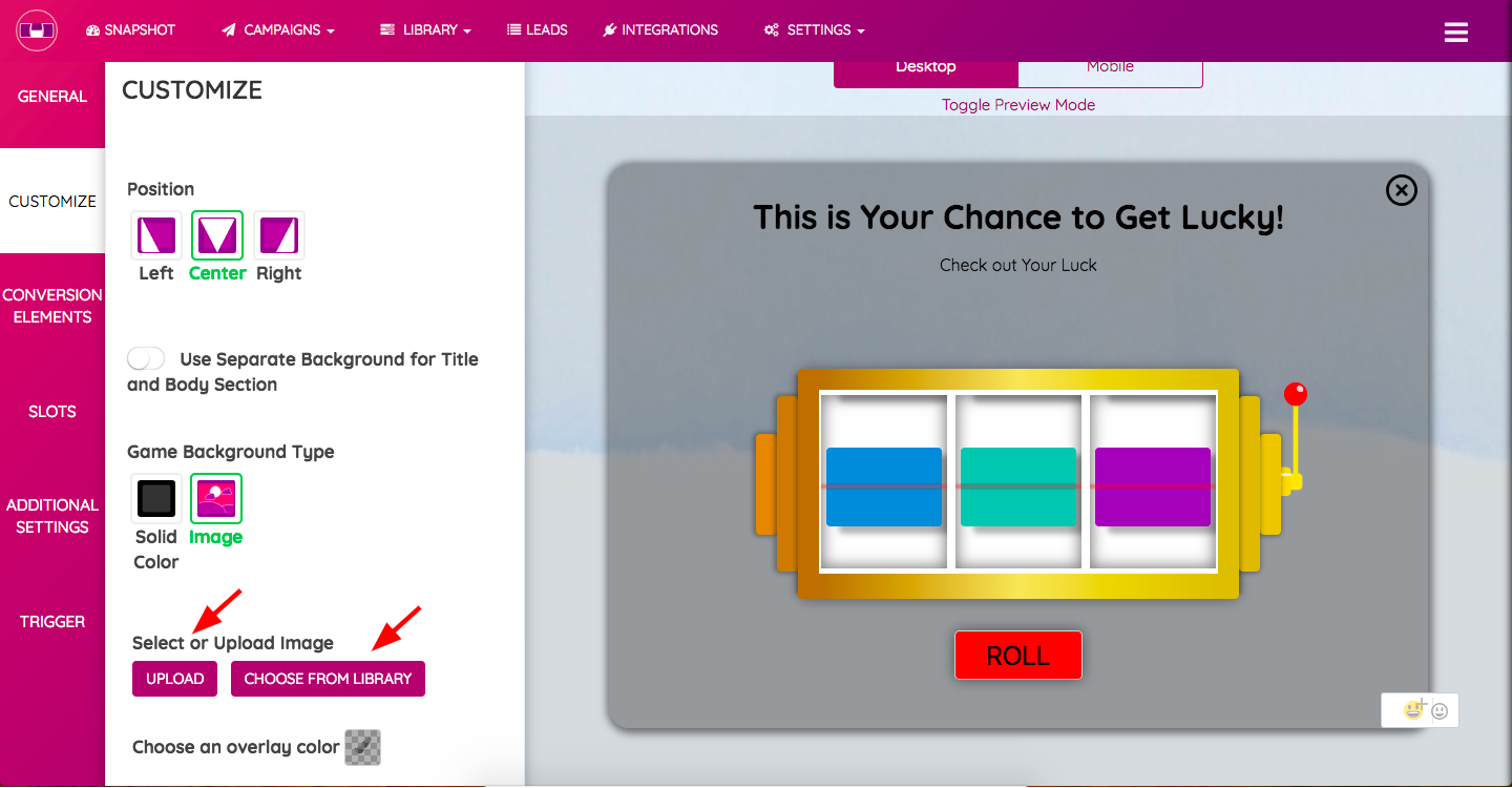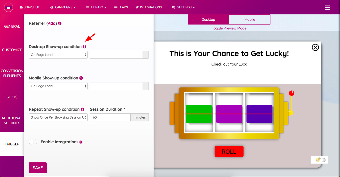 D. Desktop Show-up condition: You can configure how do you want to show up the slot campaign on a desktop like exactly after the page loads or after the user have spent some time on the website. To learn more about Show-up Conditions, click here.