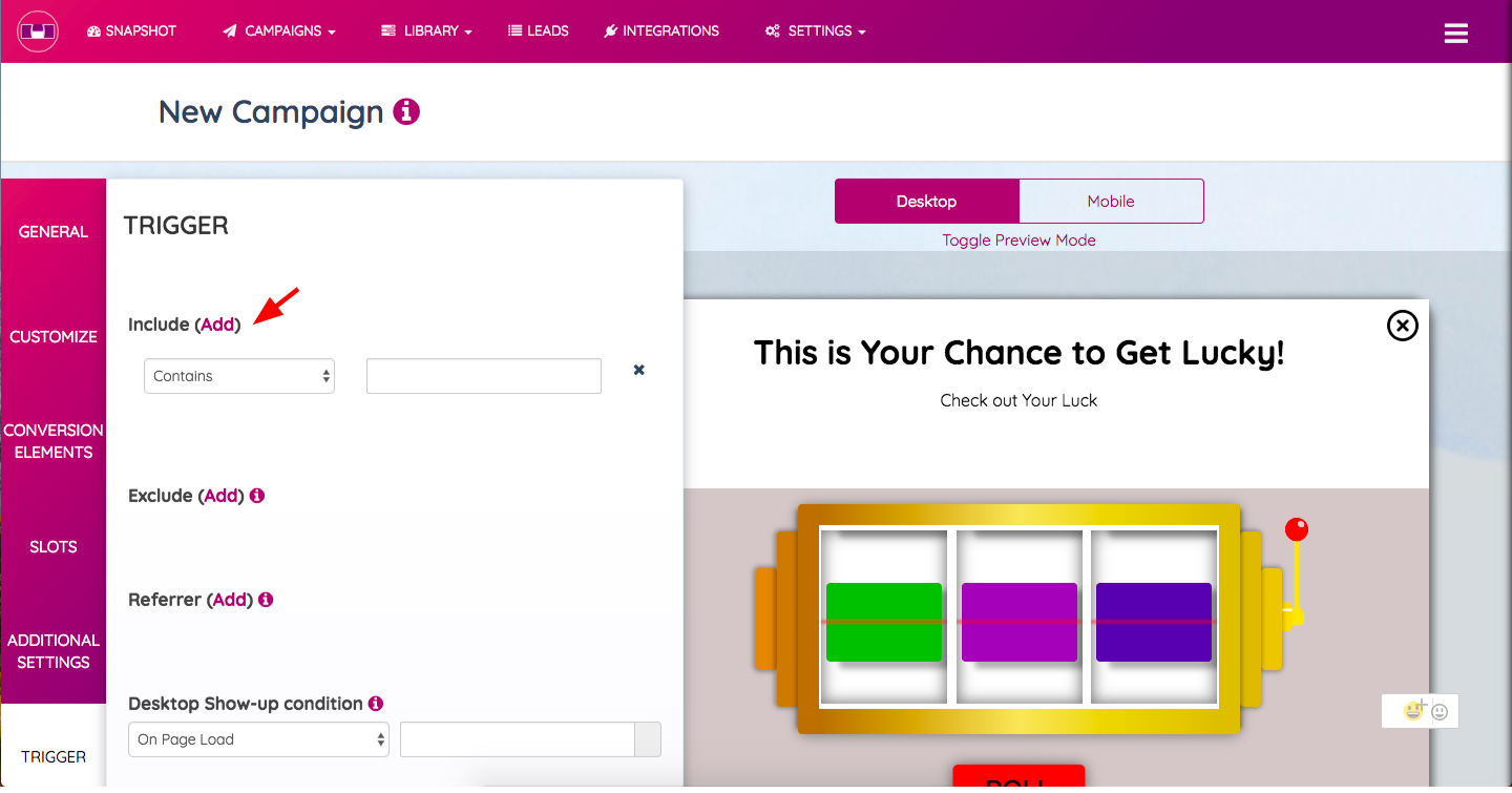 A. Include:This is where the slot campaign will display. You can choose where you wish to show the campaign. You may want to learn more about URL Targeting, click here.