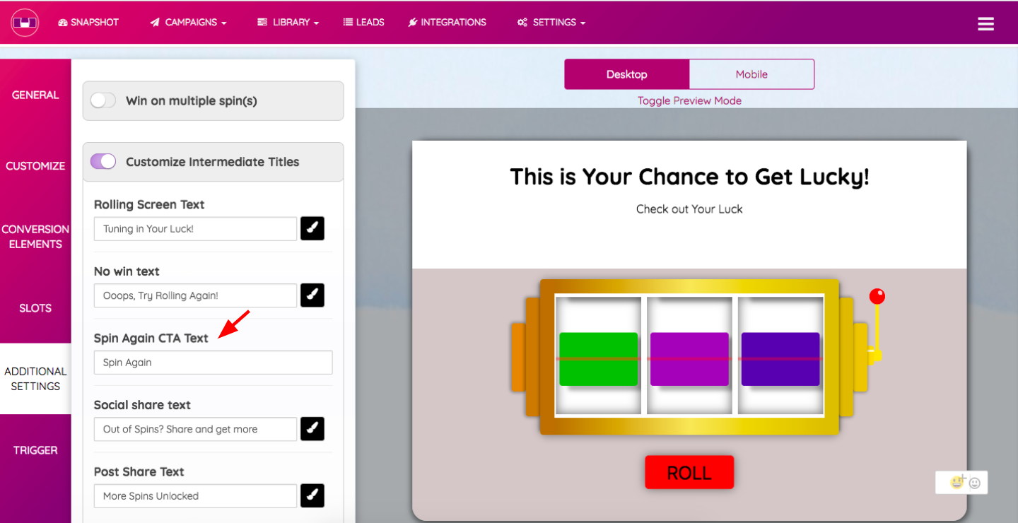 Spin Again CTA Text- Under this, you can write whatever you wish to display on the CTA button when the visitor spins again.