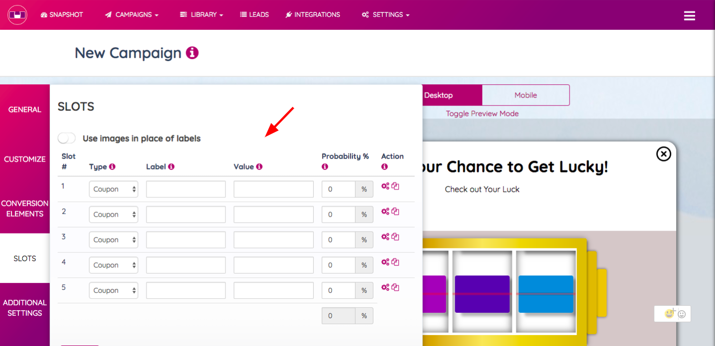 NOTE : You may choose to set the slot probability as “100” in case you’d want to have that slot always show up after the visitor has spun the machine.