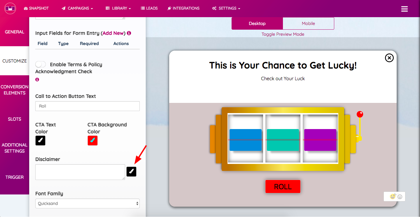 H. Disclaimer: Under this section, you can customise whatever you wish to display as a disclaimer in the Slot Campaign. You can choose the color of the text by clicking on the brush icon.