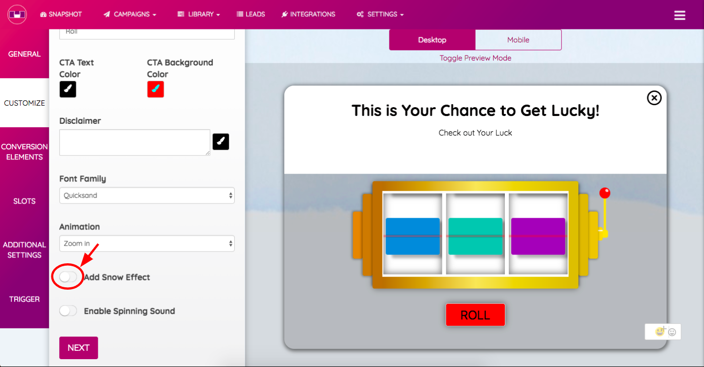 K. Add Snow Effect: Under this section, you can add the snow effect into your Slot Campaign by simply sliding the toggle with the name “Add Snow Effect” to the right hand side.