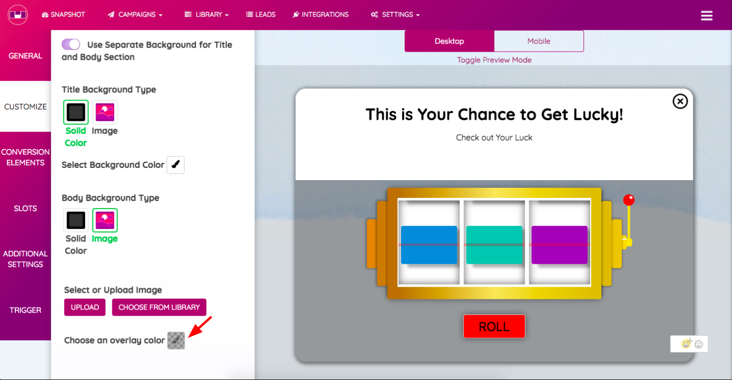 C. Title: Under this section, you can write whatever you wish to display on the Slot Campaign. At the same you can also customise the color of the title by clicking on the brush icon.