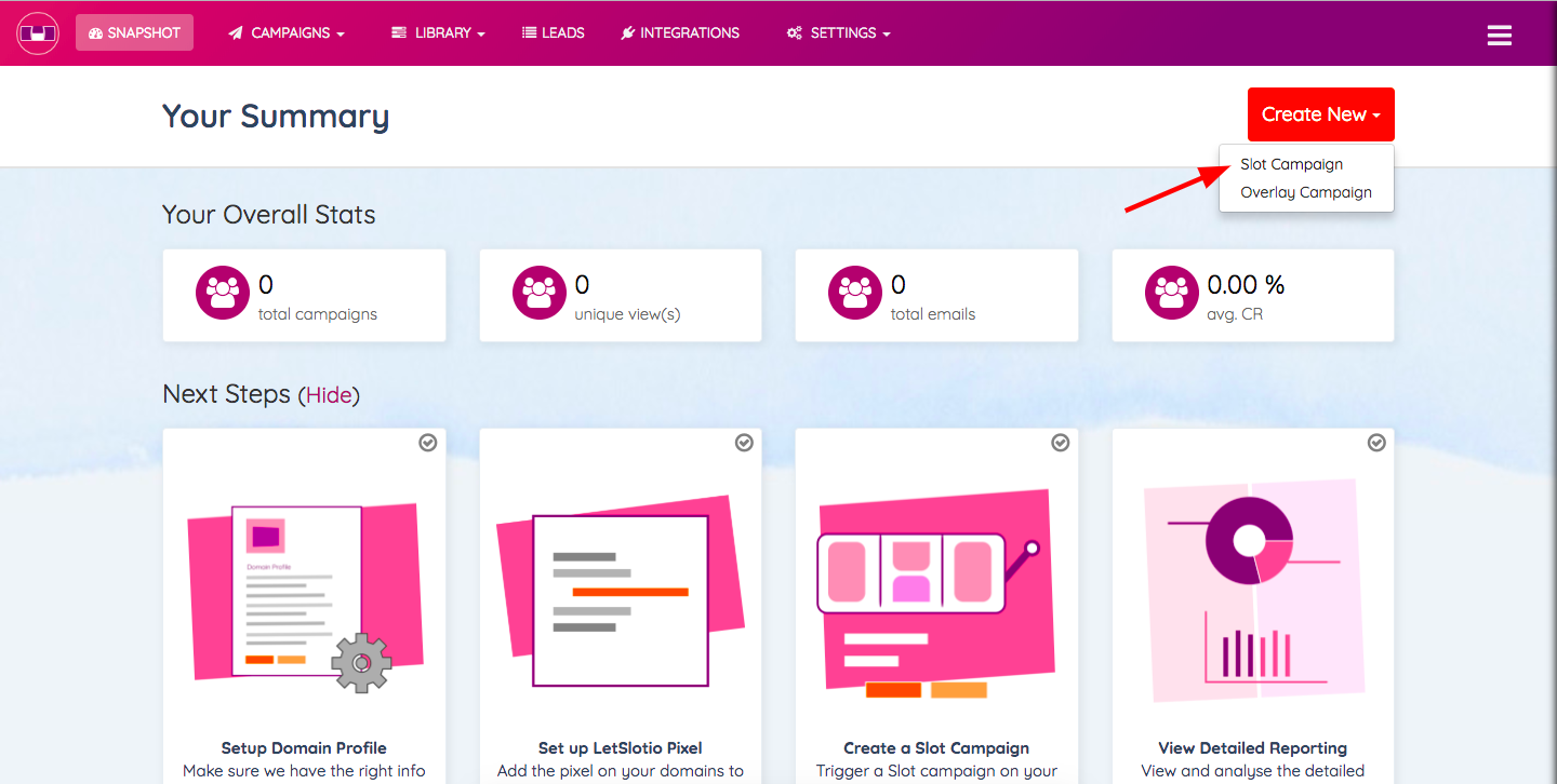 STEP 1:In your LetSlot.io Dashboard and click on “Create New” and select “Slot Campaign”.