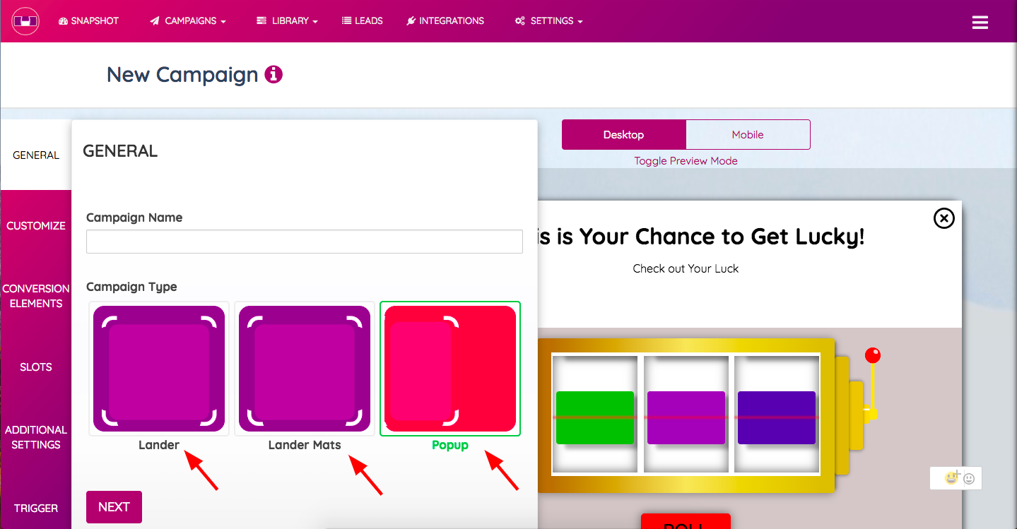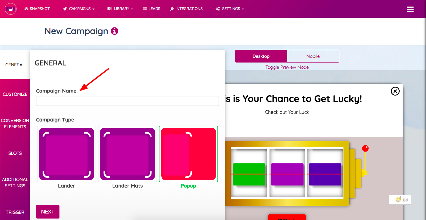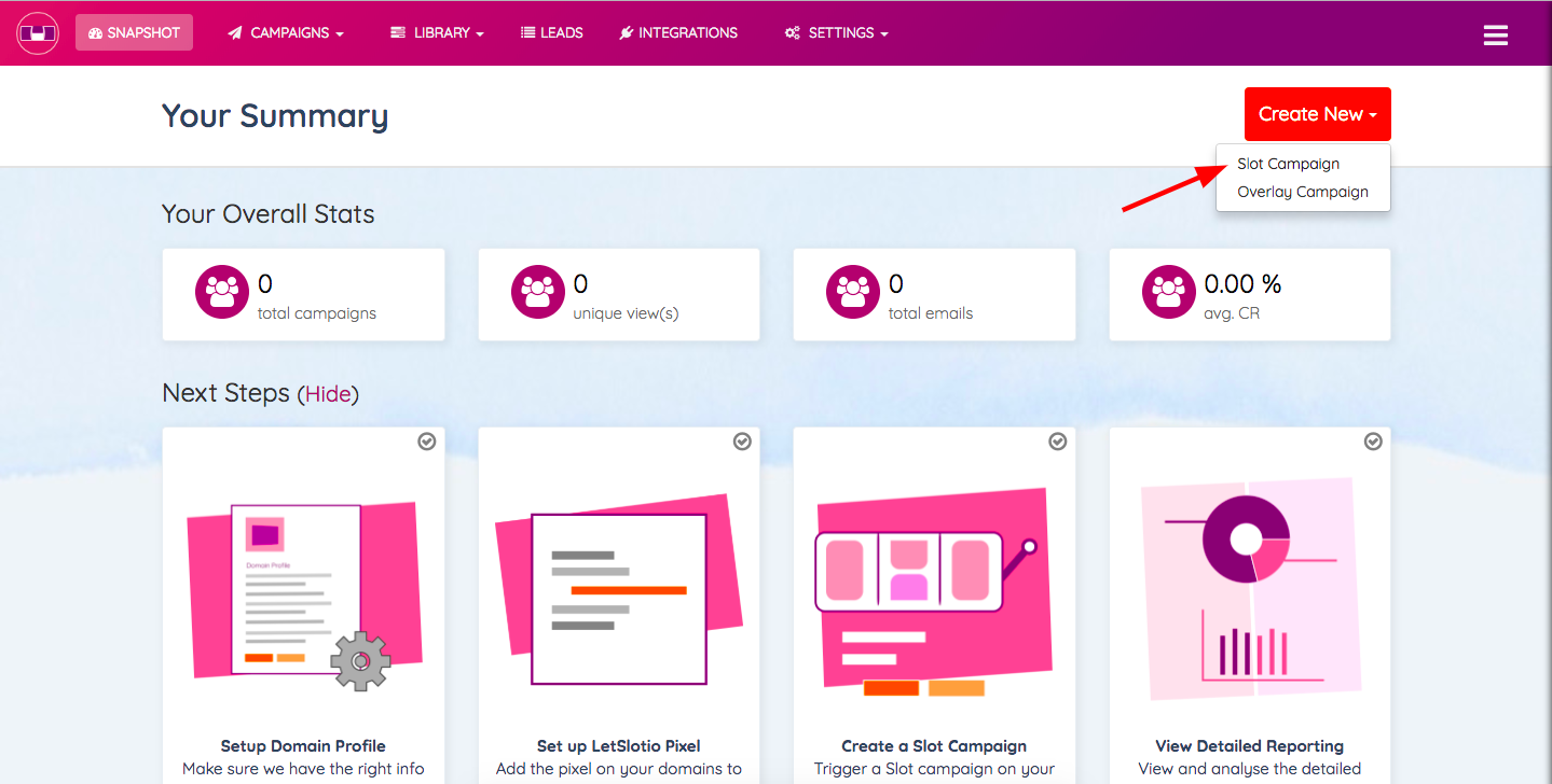 STEP 1: In your LetSlot.io Dashboard and click on “Create New” and select “Slot Campaign”.