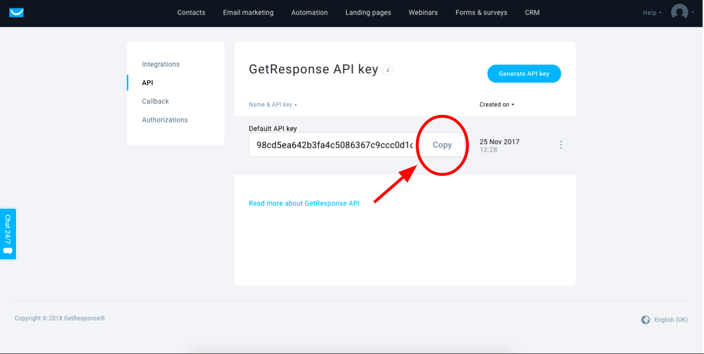 In order to Sync Leads with GetResponse, follow the steps listed below- STEP 1: Login to your GetResponse account, go to the Navigation Bar, click on Integrations and API. STEP 2: Click on API under Integrations on the left-hand side. STEP 3: Click ...