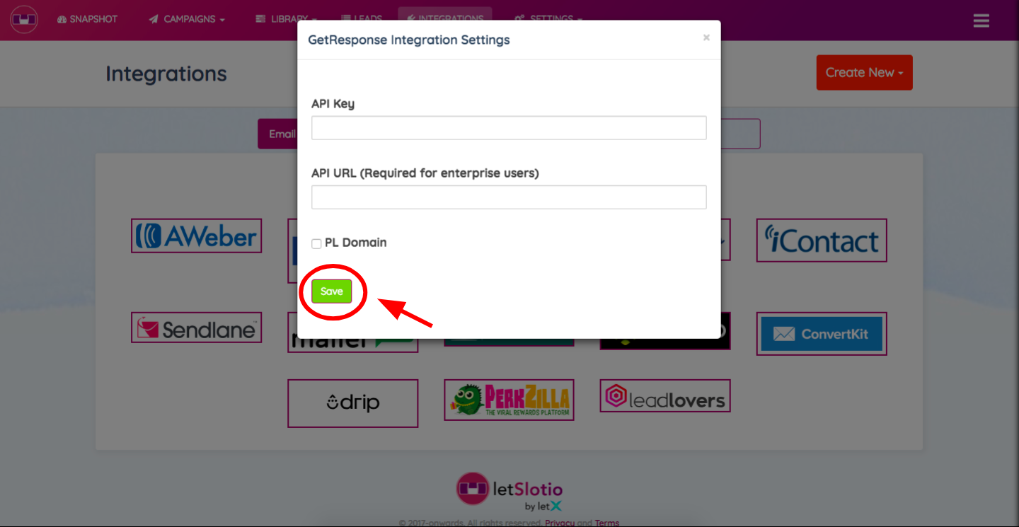 STEP 4: Click on GetResponse icon and paste your GetResponse API Key in the API Key Field and press “Save”.