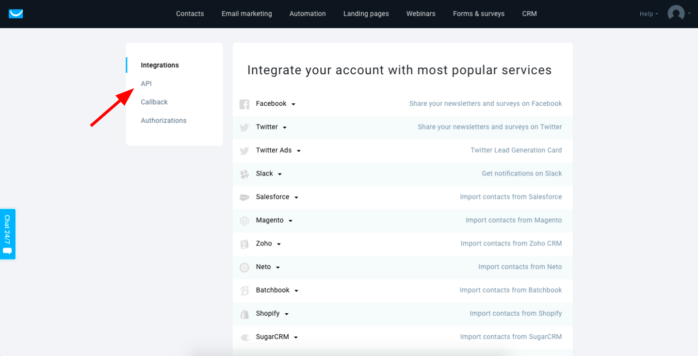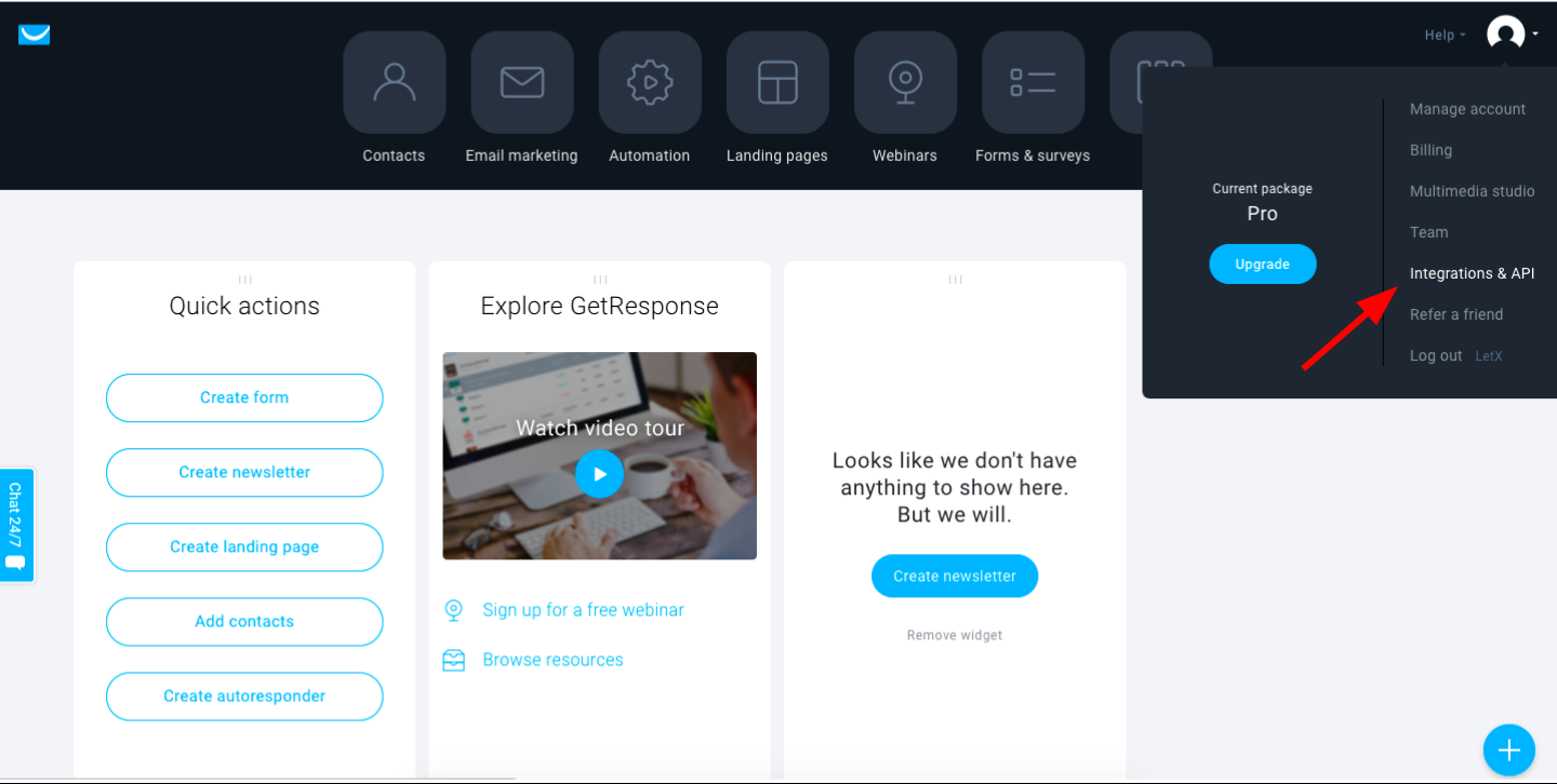 STEP 1: Login to your GetResponse account, go to the Navigation Bar, click on Integrations and API.