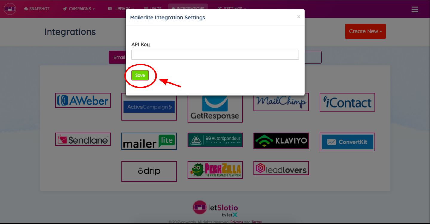 STEP 3: Click on “Copy” under API KEY, then come to your LetSlot.io Dashboard, go to Integrations.